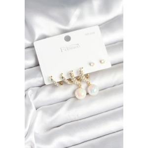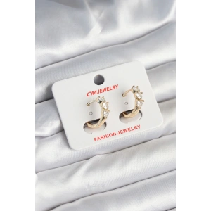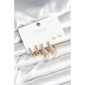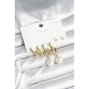 Pirinç Gold Renk Zirkon Taşlı İnci Detaylı 925 Ayar Gümüş Çivili Kadın Küpe Seti