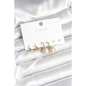 Pirinç Gold Renk İnci Detaylı 925 Ayar Gümüş Çivili Kadın Küpe Seti