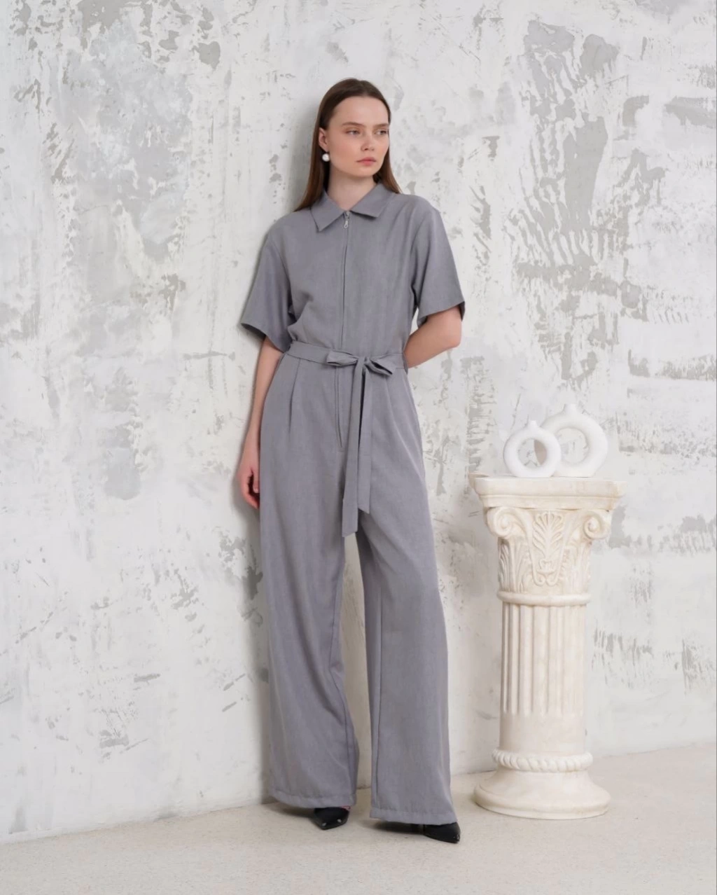 Gri kuşaklı gömlek yaka salaş tulum ile tarzınızı ortaya koyarken, gün boyu konforun keyfini çıkarın.