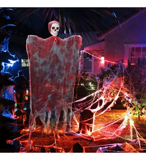 Led Işıklı Kahkaha Atan Sesli Sensörlü Ürpertici Kuru Kafa Kanlı Korku Hayalet Saçaklı Dekor 90x50 cm