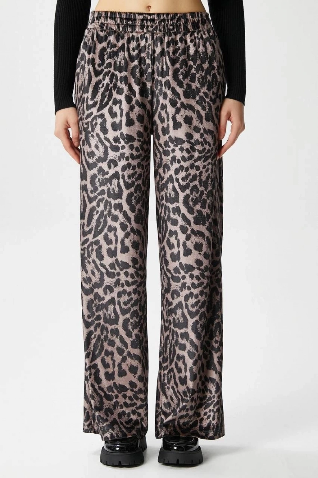 Deri geniş paça beli lastikli pantolon bej h263644