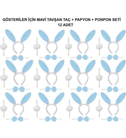 Mavi Tavşan Kostüm Seti – Taç, Papyon, Ponpon (12’li Paket)