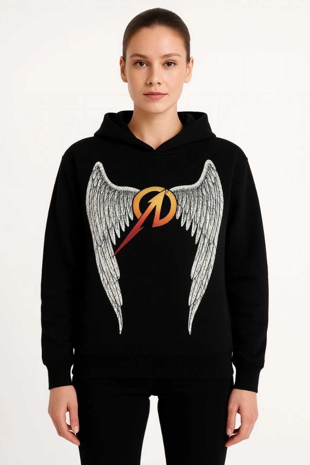 Üç İplik Kapüşonlu Baskılı Oversize SweatShirt- Siyah