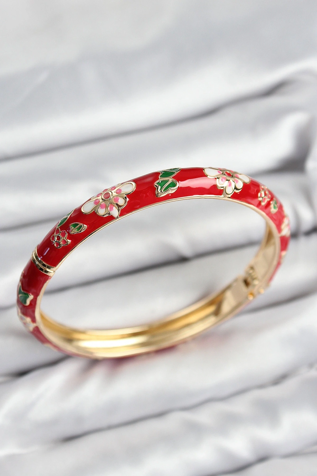 Mineli Pirinç Kırmızı Çiçek Motifli Gold Kadın Kelepçe