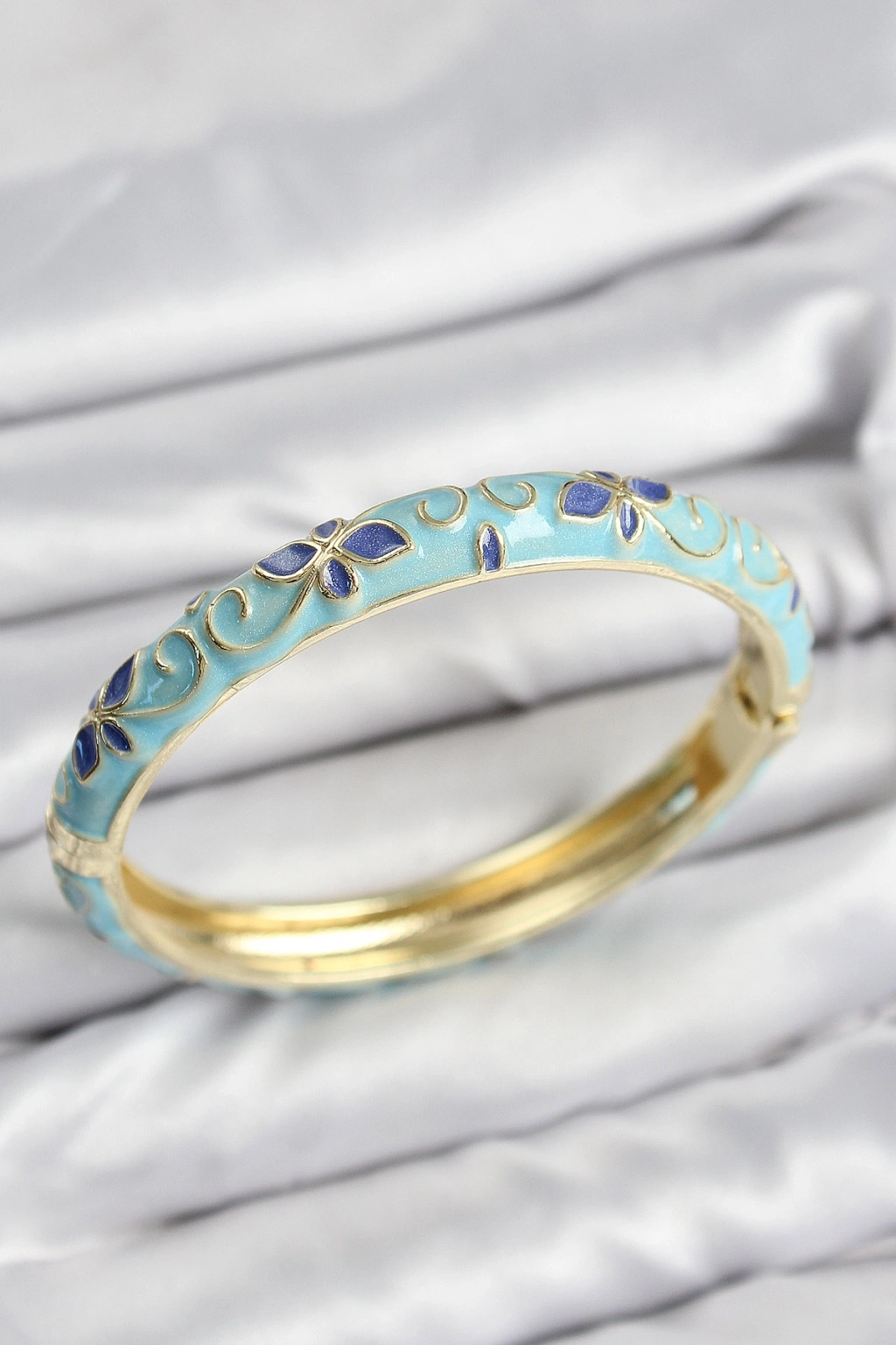 Mineli Pirinç Turkuaz Çiçek Motifli Gold Kadın Kelepçe