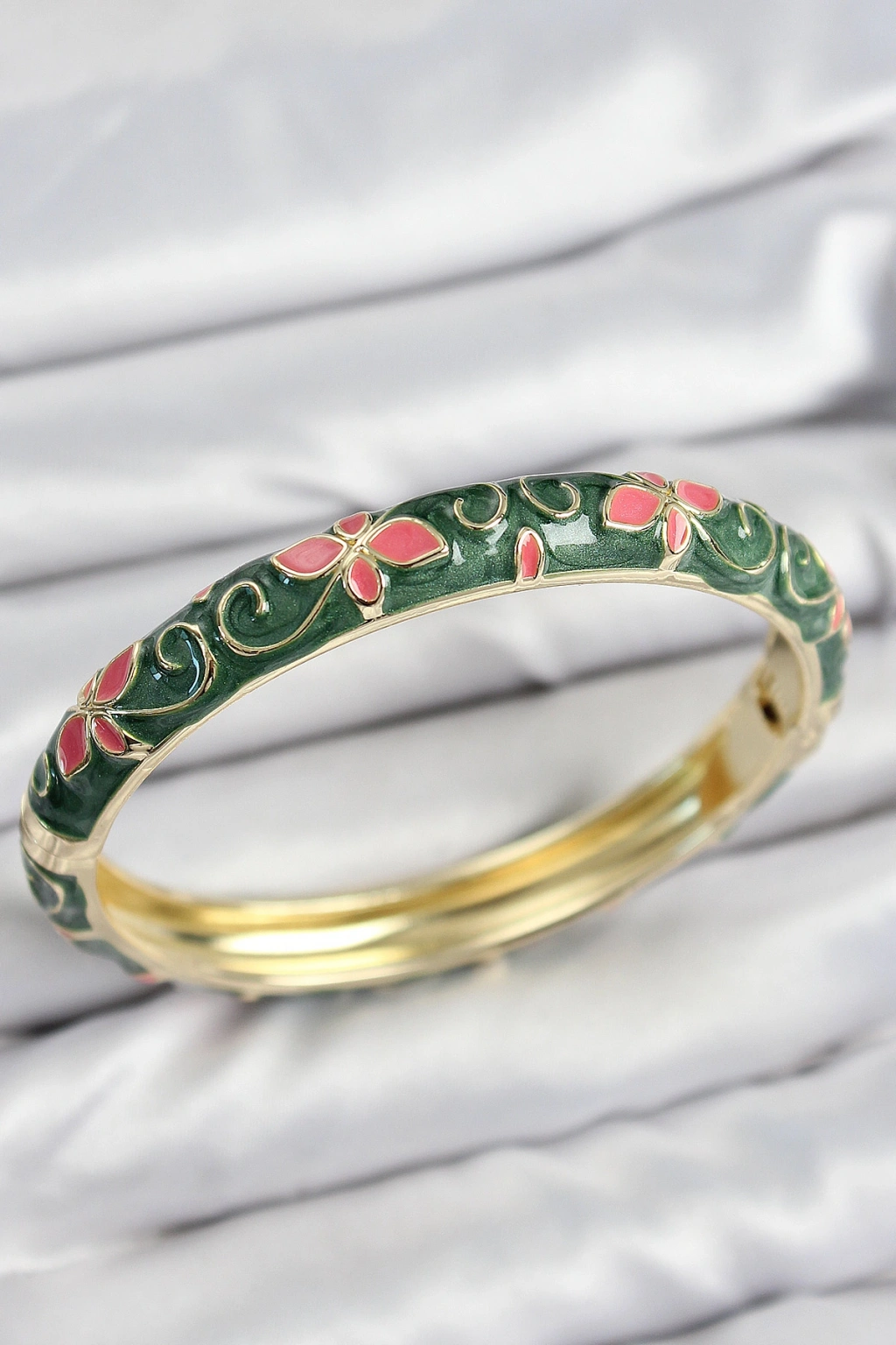Mineli Pirinç Yeşil Çiçek Motifli Gold Kadın Kelepçe
