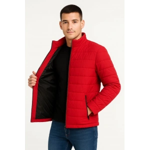 ERKEK ŞİŞME KAPÜŞONLU FERMUARLI MONT SU İTİCİ KAPİTONE ASTARLI KUMAŞ CEPLİ KIŞLIK RAHAT KALIP - KIRMIZI