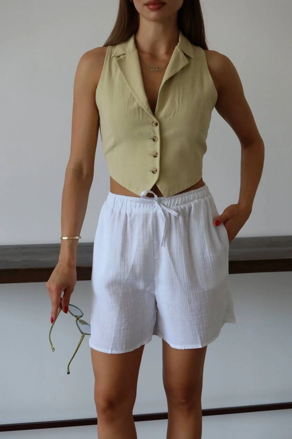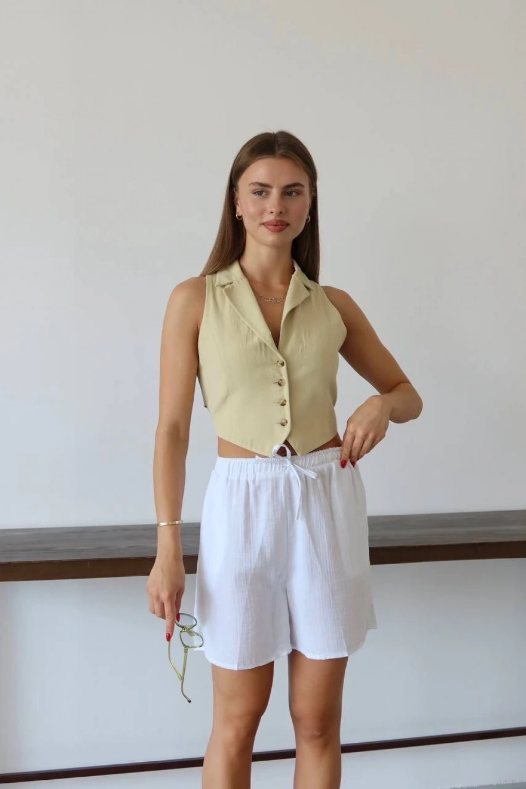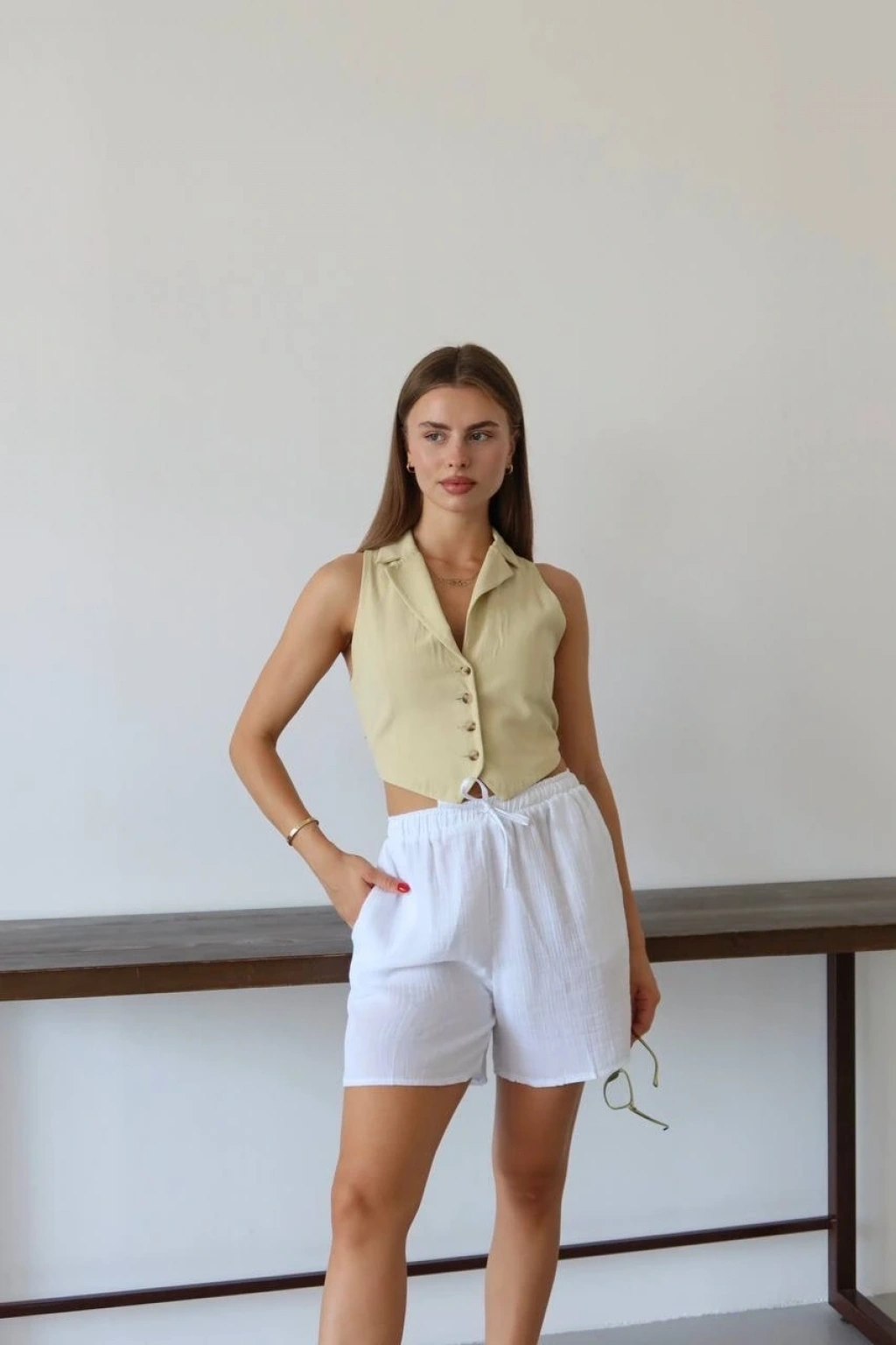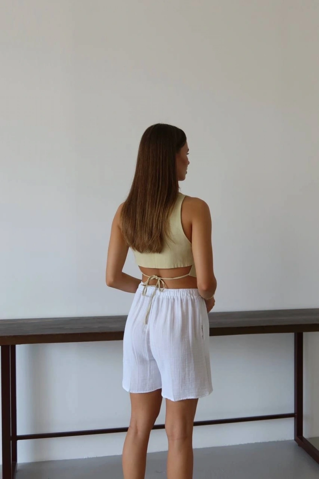 Müslin kumaş şort bağcıklı bej pt