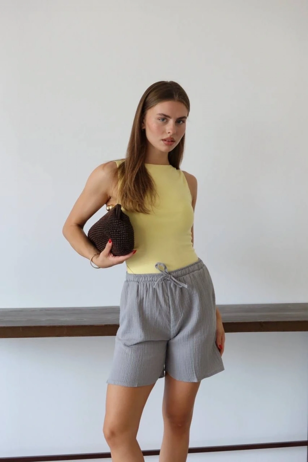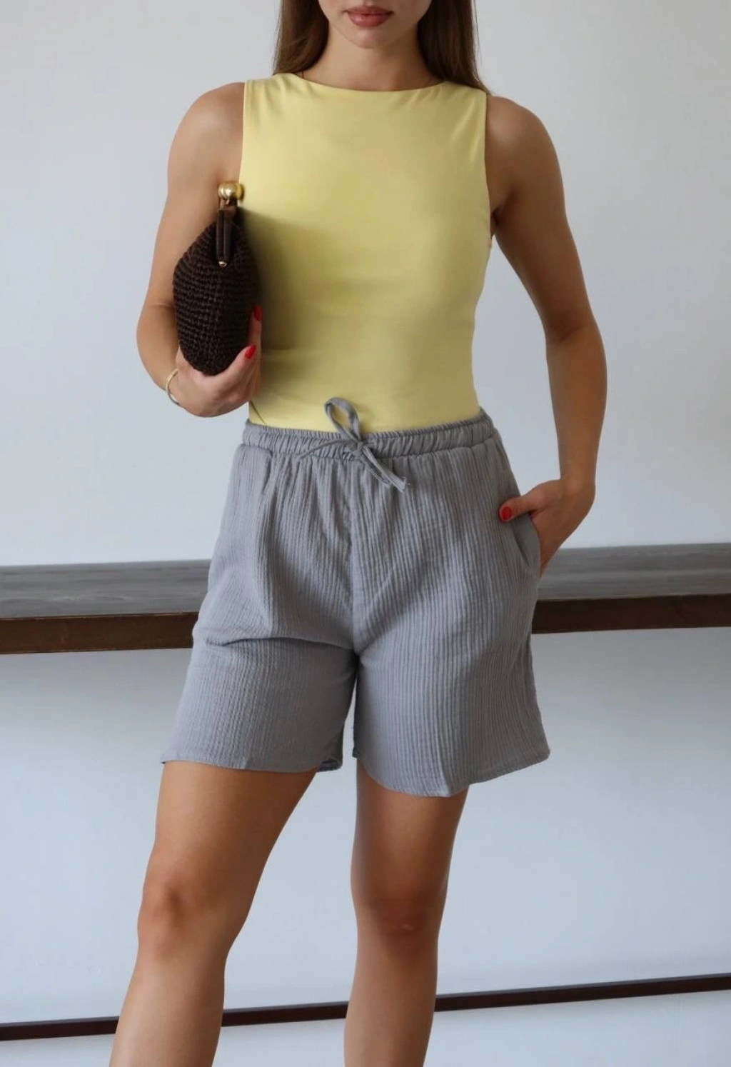 Müslin kumaş şort bağcıklı bej pt