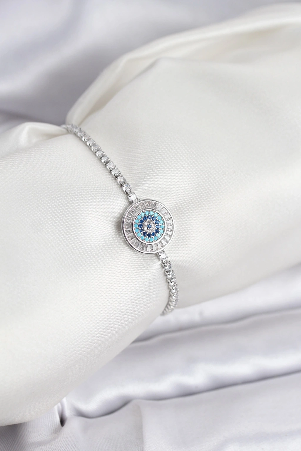 Nazar Model Zirkon Taşlı Gümüş Renk Asansörlü Su Yolu Bileklik