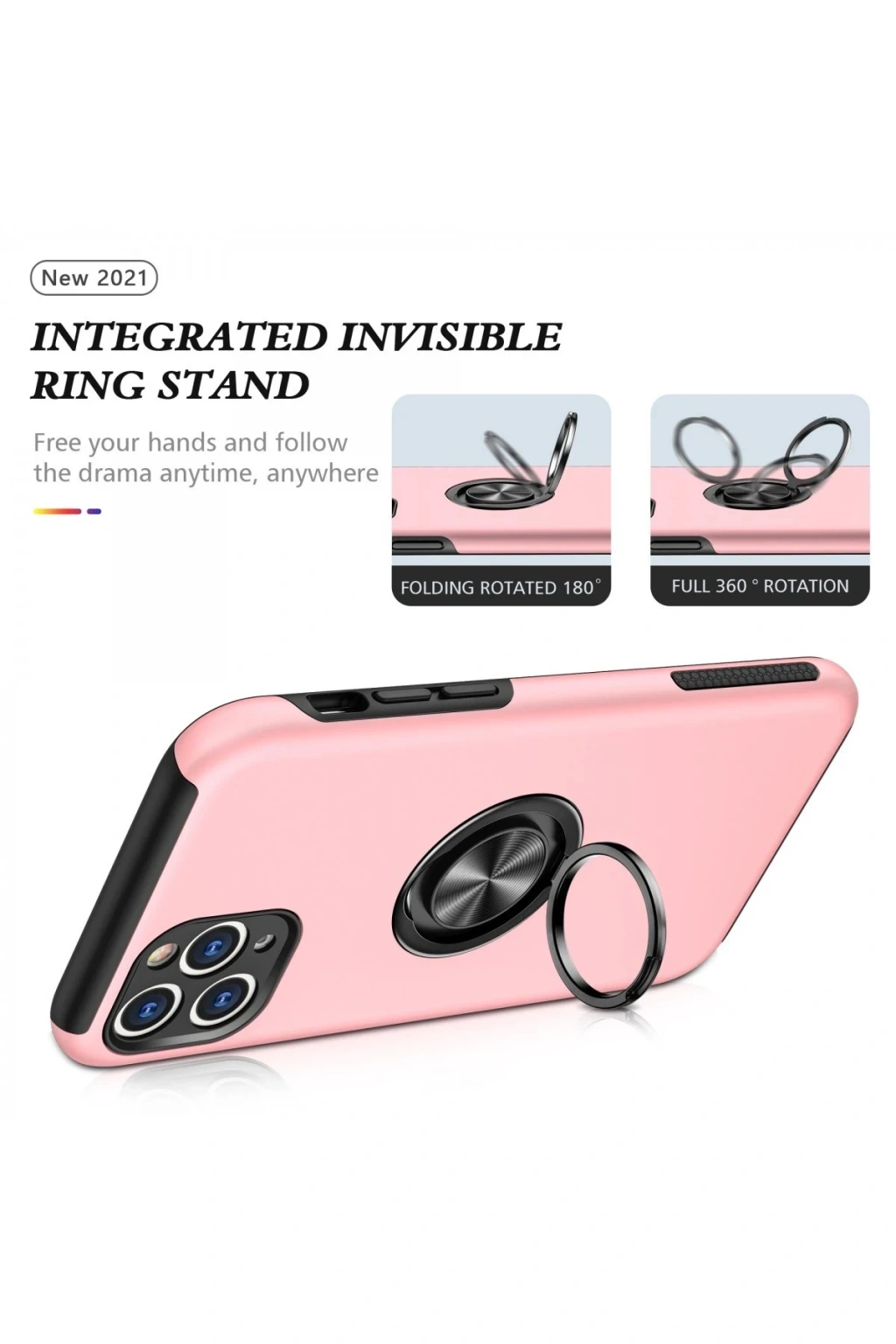 Kapak üzerinde yer alan 360° dönebilen silindir metal yüzük, hem stand işlevi görür hem de mıknatıs özelliği sayesinde araç içi manyetik telefon tutucularla tam uyum sağlar.