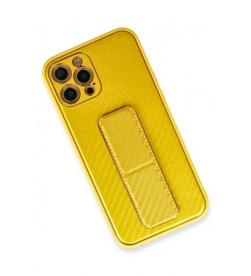 Newface iPhone 12 Pro Max Kılıf Coco Karbon Standlı Kapak - Sarı