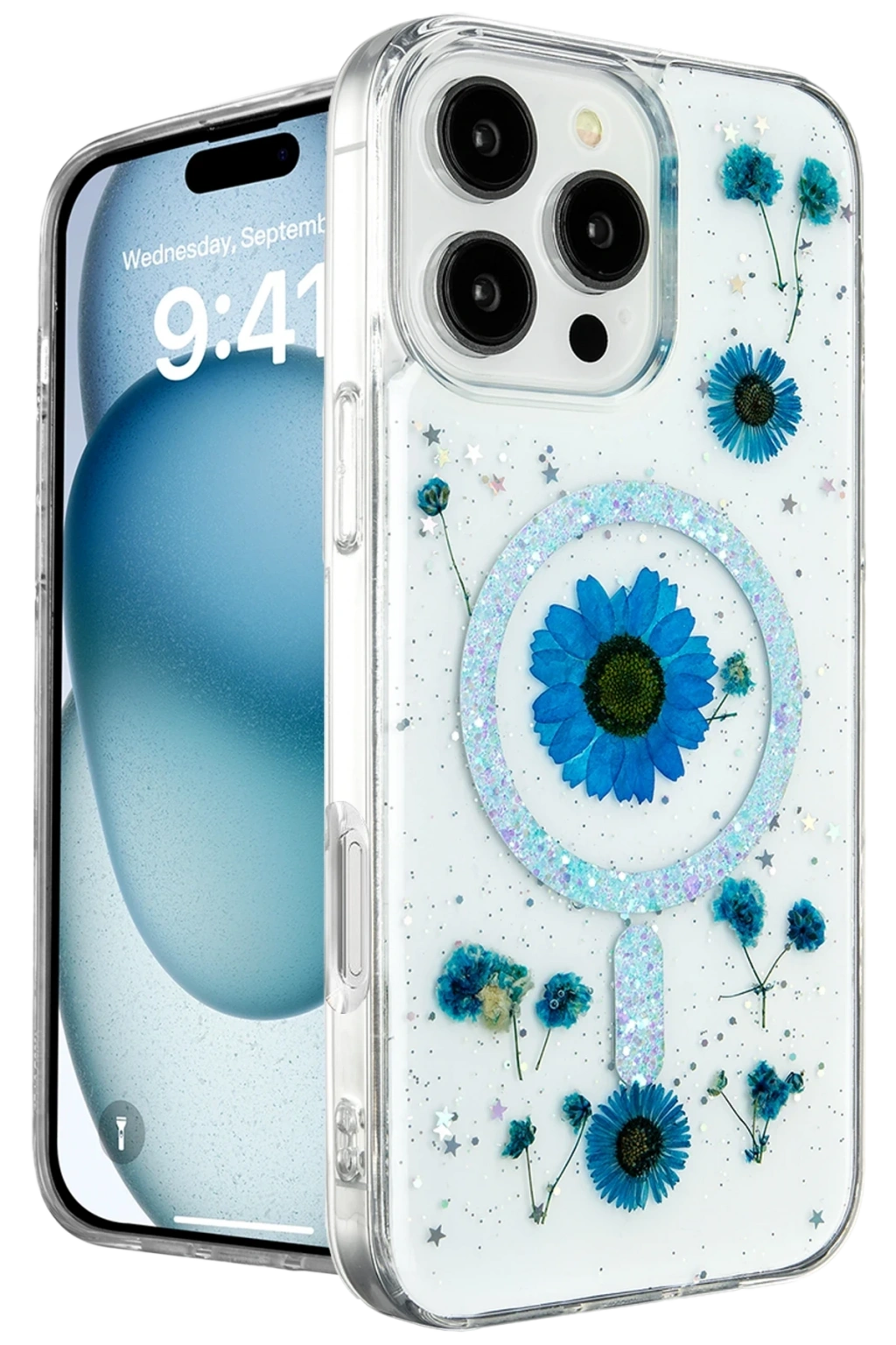 Newface iPhone 16 Pro Max Kılıf Daisy Simli Magsafe Kapak - Mavi