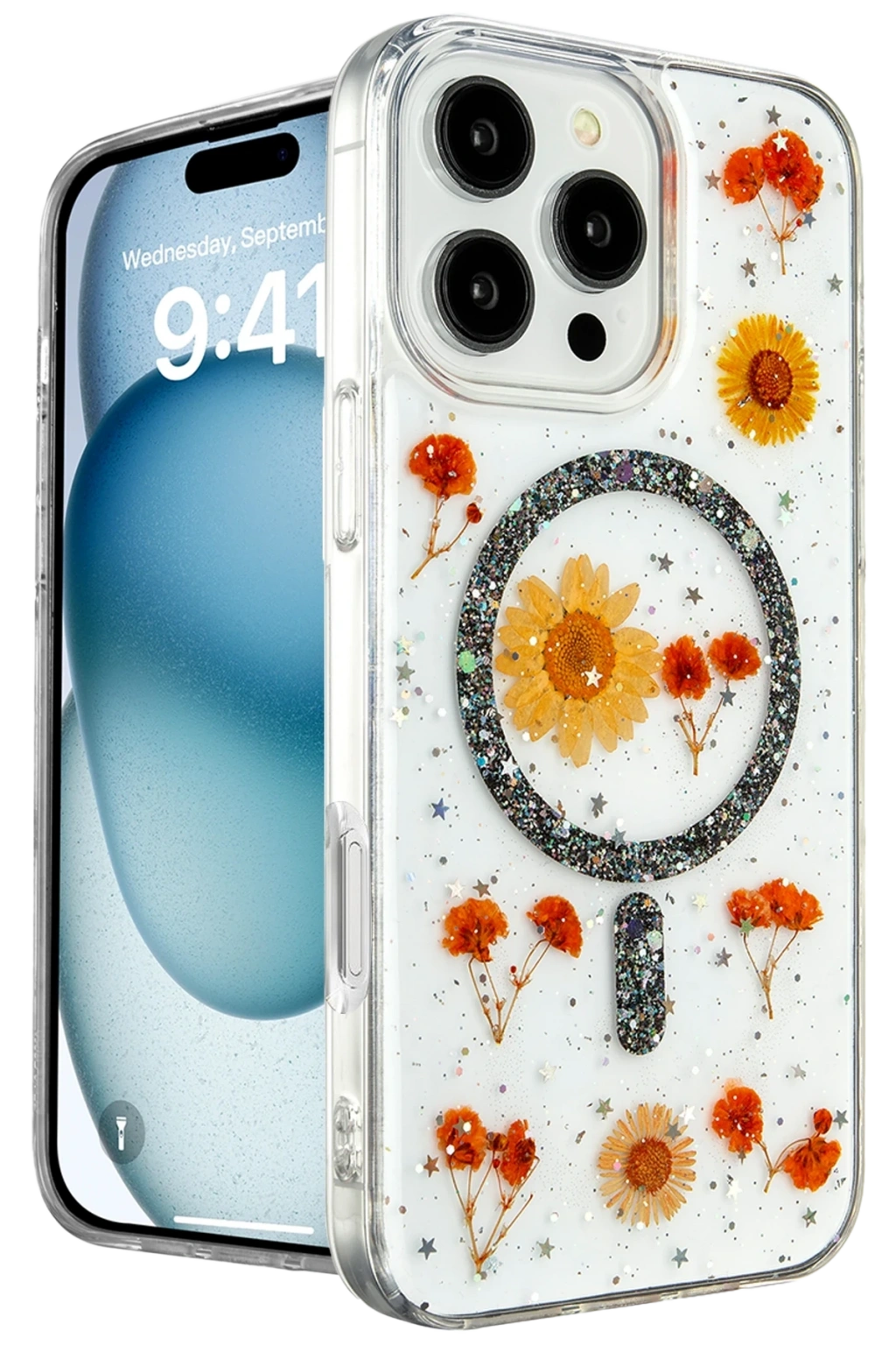 Daisy Simli MagSafe Kapak, doğanın zarafetini ve sadeliğini yansıtan, içinde gerçek çiçeklerin bulunduğu eşsiz bir tasarıma sahiptir. Kapak, içindeki gerçek papatya çiçekleri ve simli arka planı ile cihazınıza doğal bir güzellik katarken, her kapak kendi içinde benzersizdir. Bu, telefonunuzu hem korurken hem de ona kişisel bir dokunuş ekler.