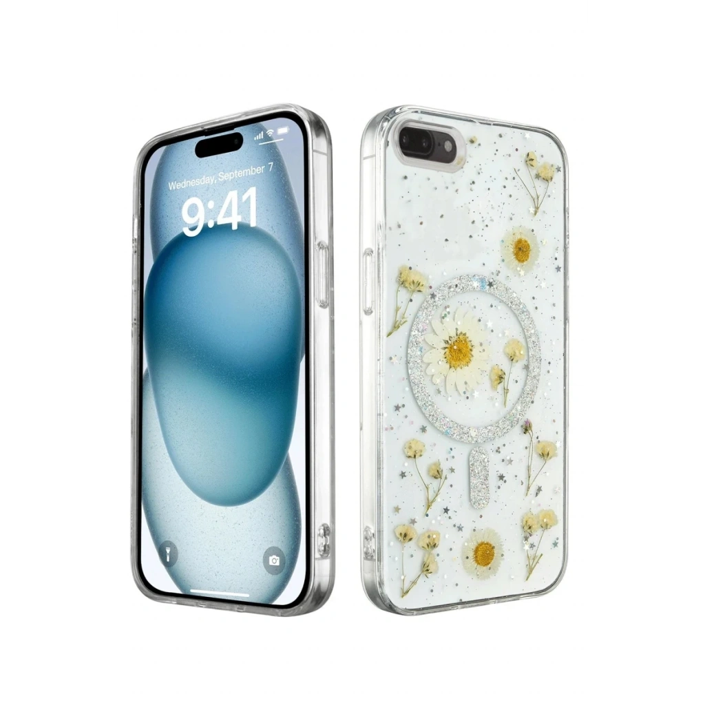 Daisy Simli MagSafe Kapak, doğanın zarafetini ve sadeliğini yansıtan, içinde gerçek çiçeklerin bulunduğu eşsiz bir tasarıma sahiptir. Kapak, içindeki gerçek papatya çiçekleri ve simli arka planı ile cihazınıza doğal bir güzellik katarken, her kapak kendi içinde benzersizdir. Bu, telefonunuzu hem korurken hem de ona kişisel bir dokunuş ekler.