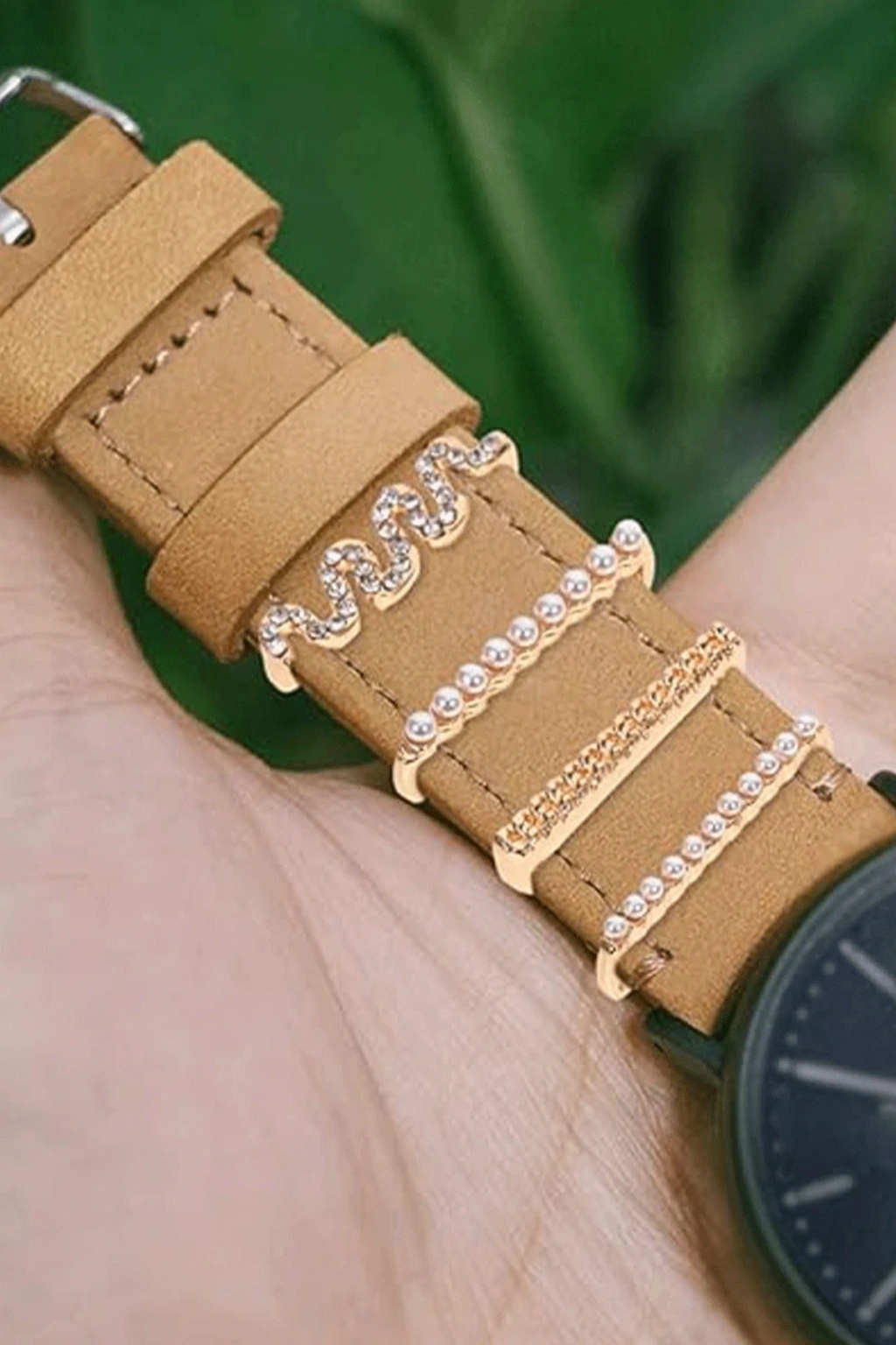 Her bir parça, göz alıcı taşlar ve inci detaylarla işlenmiştir; sade kayışlara benzersiz bir şıklık kazandırır.