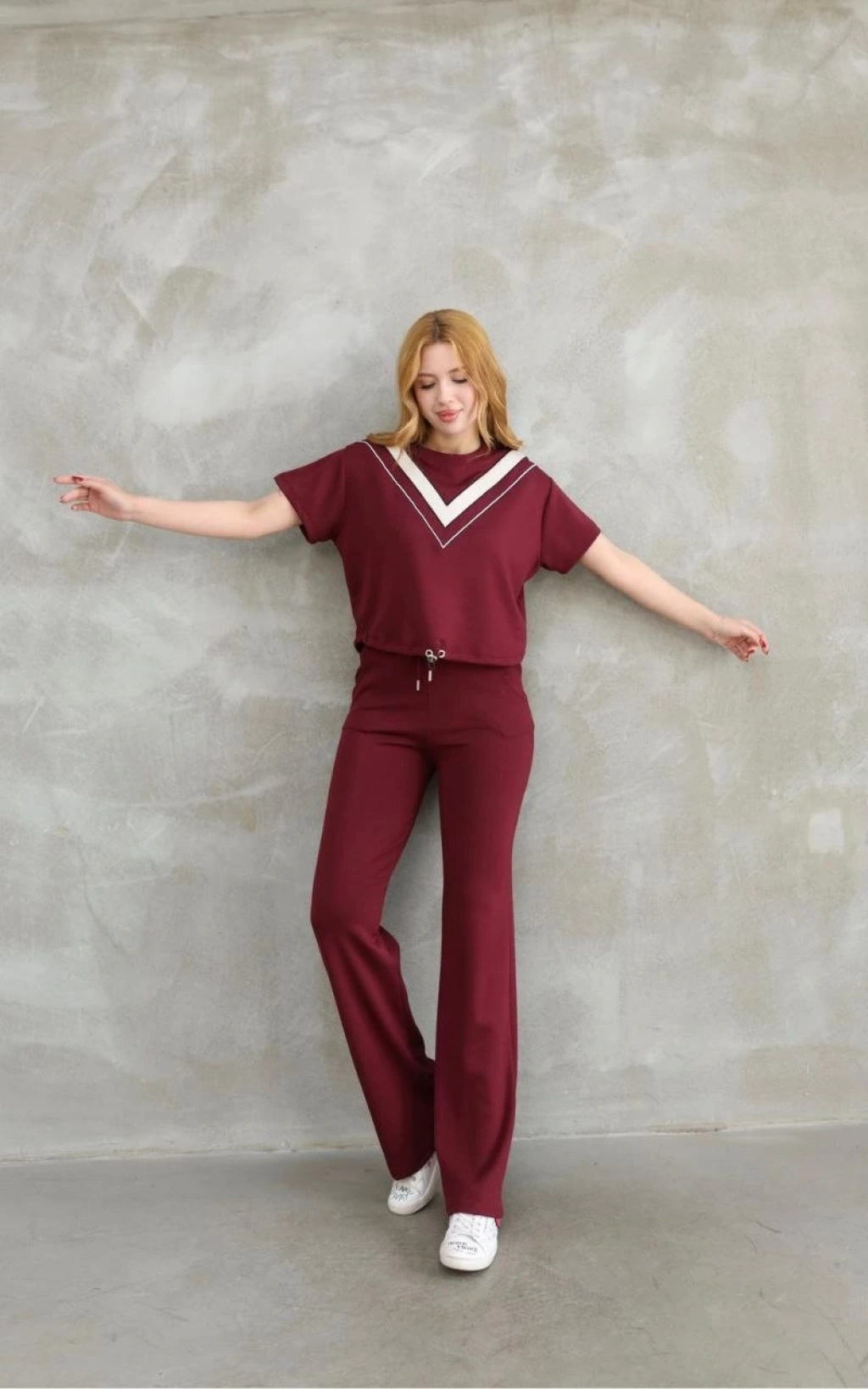 Osy Modal Yumuşak Dokulu Kumaş Bisiklet Yaka T-shirt Bol paça Pantalon ikili Takım -Bordo
