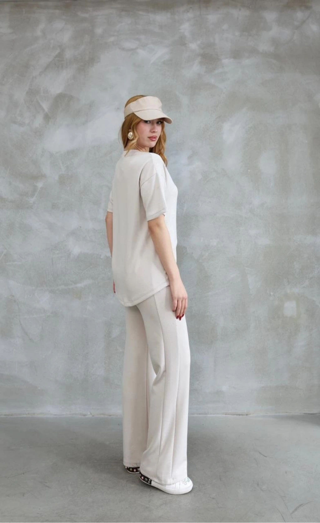 Yakalı Düğmeli Uzun Kollu Gömlek Pantolon ikili Takım - Bej