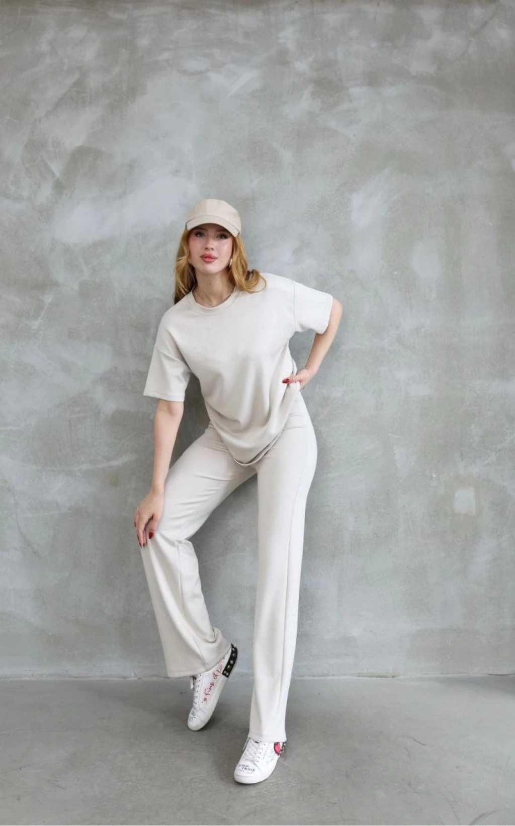 Osy Modal Yumuşak Dokulu Kumaş Bisiklet Yaka T-shirt Bol paça Pantalon ikili Takım - Boyalı Gri