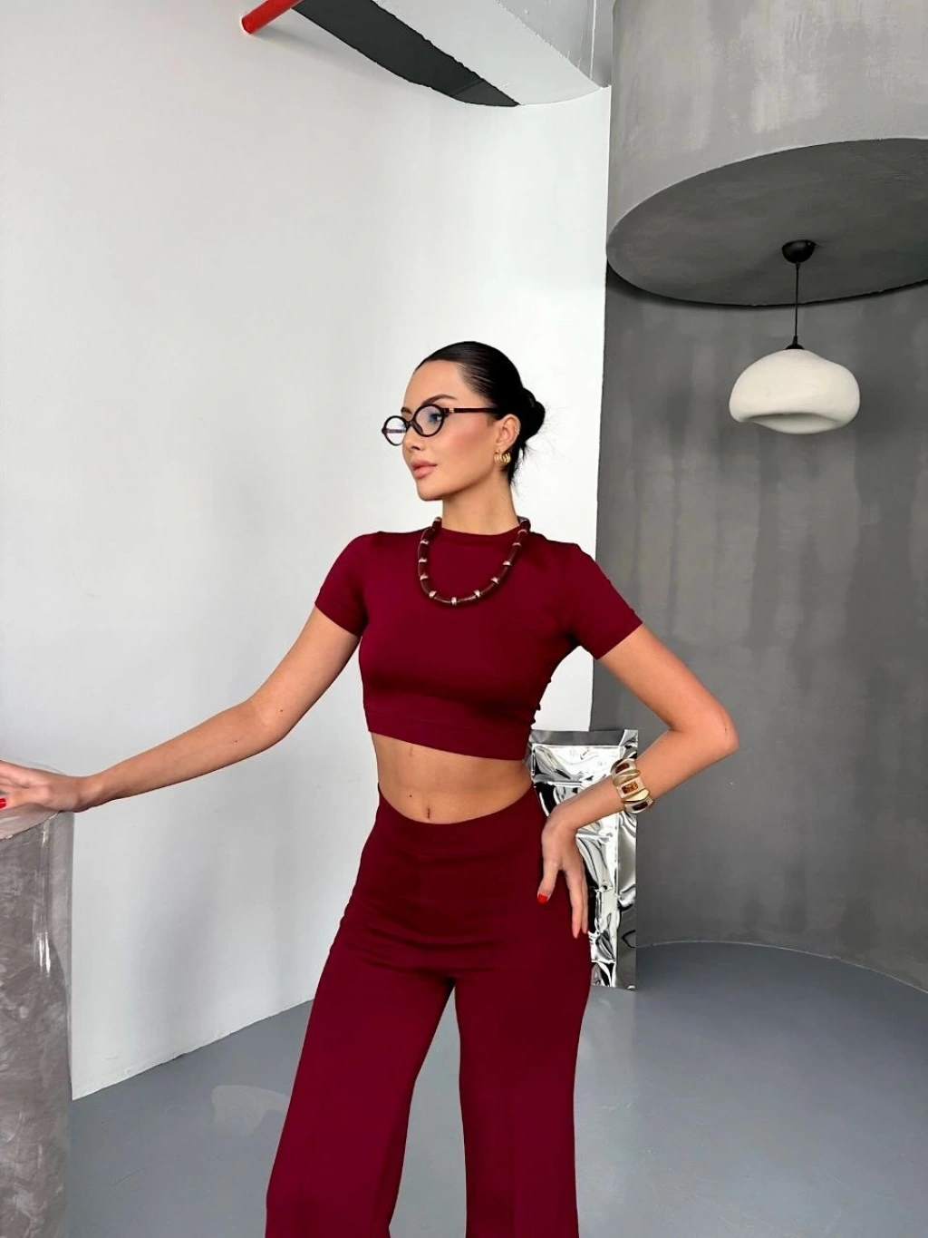 Osy Modal Yumuşak Dokulu Kumaş Bisiklet Yaka T-shirt Bol paça Pantalon ikili Takım -Bordo