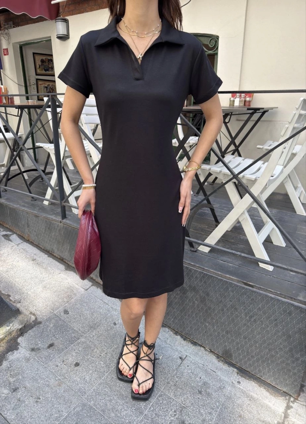 Kadın Bisiklet Yaka Kısa Kol Likralı Elbise - Siyah
