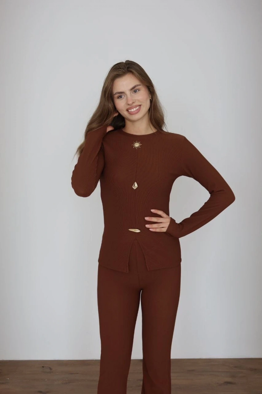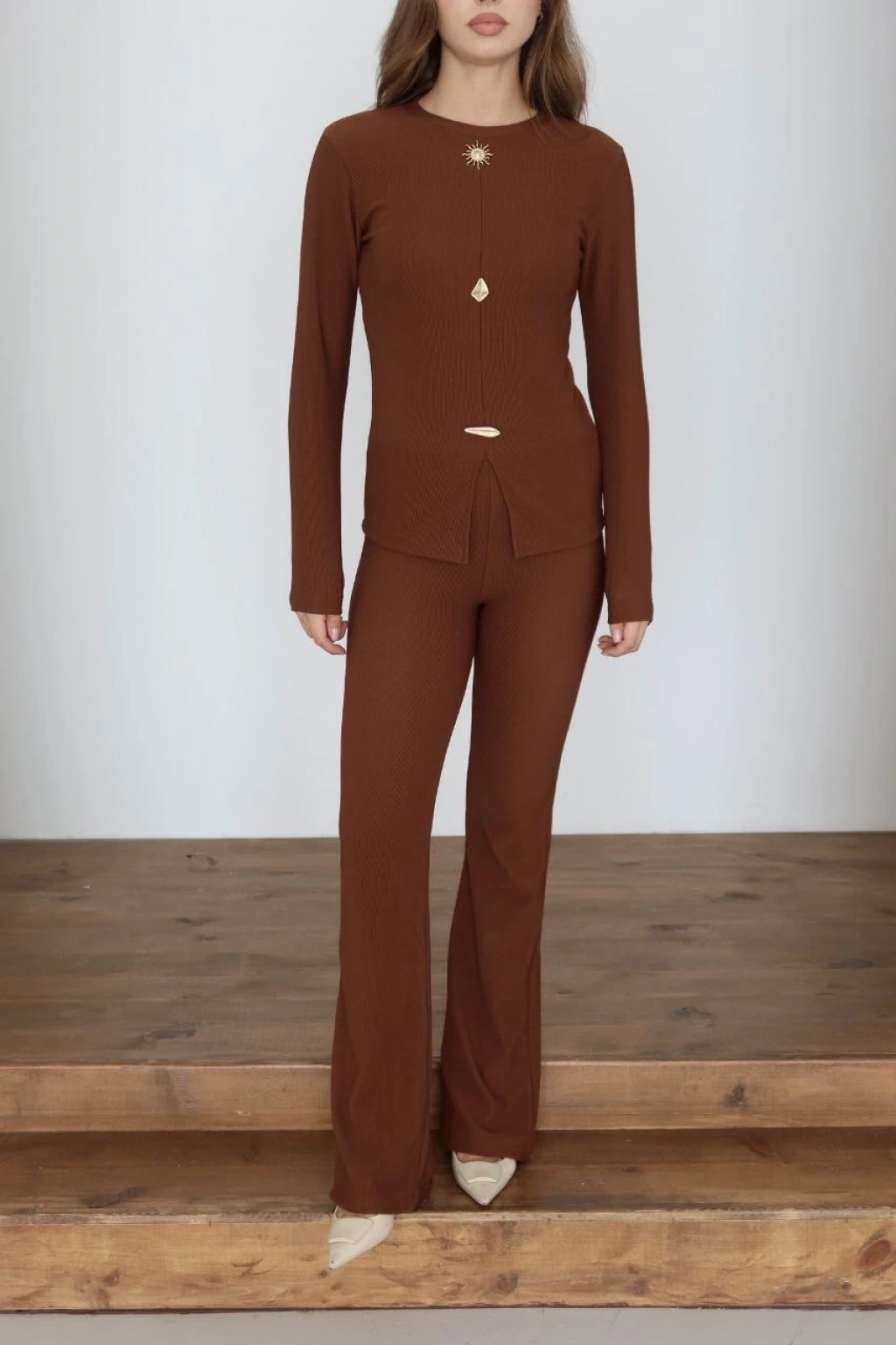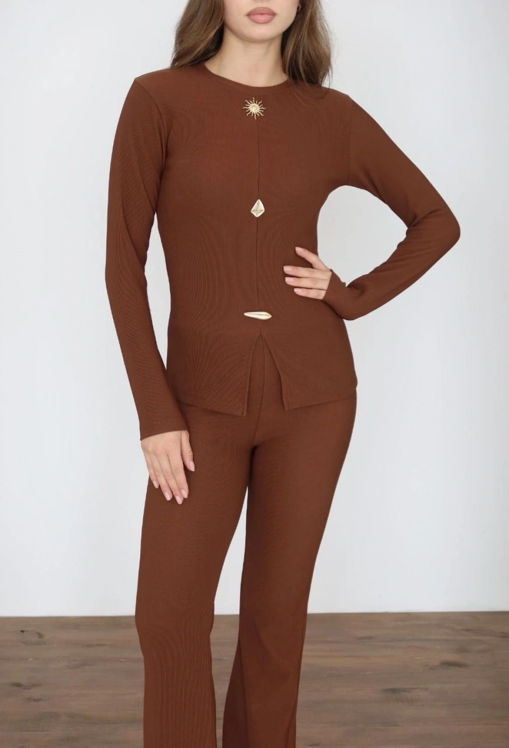 Polo yaka alt üst kollu modal takım kahve pt