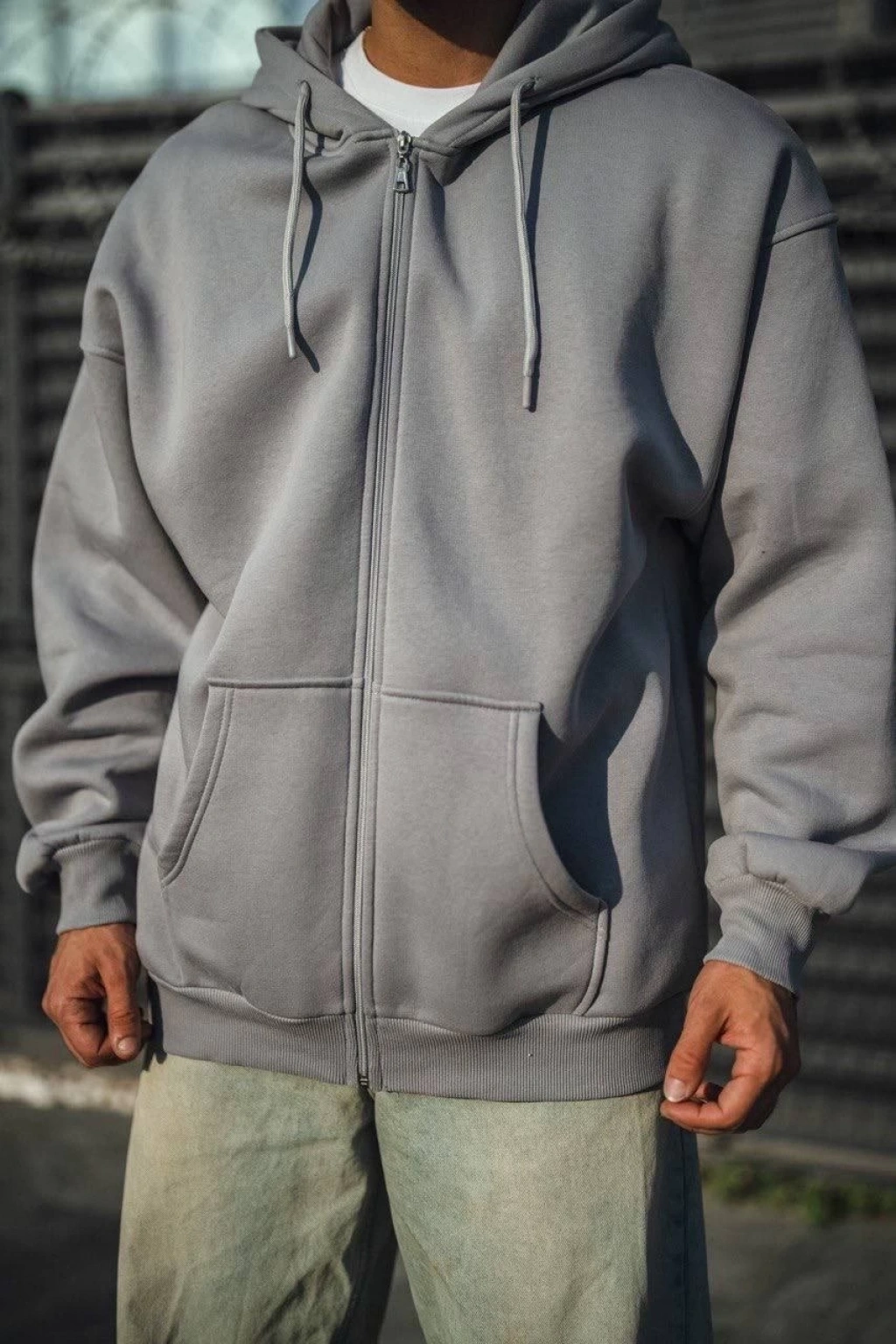 Erkek Kapüşonlu 3 İplik Şardonlu Önü Baskılı Fermuarlı Oversize Sweatshirt - Beyaz