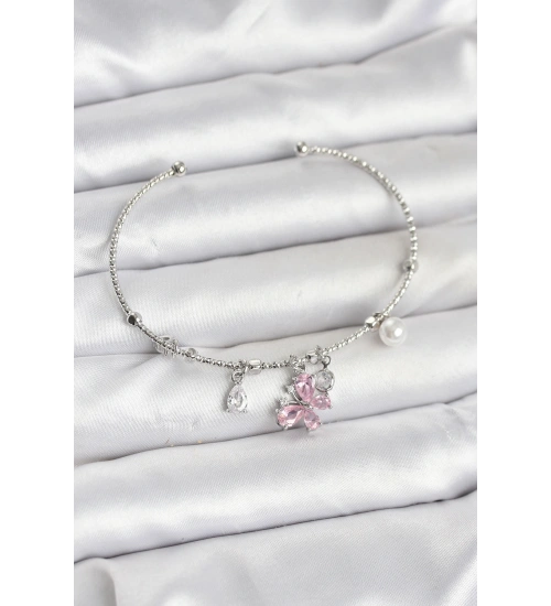 Pembe Kelebek Charmlı Gümüş Renk Kadın Bileklik