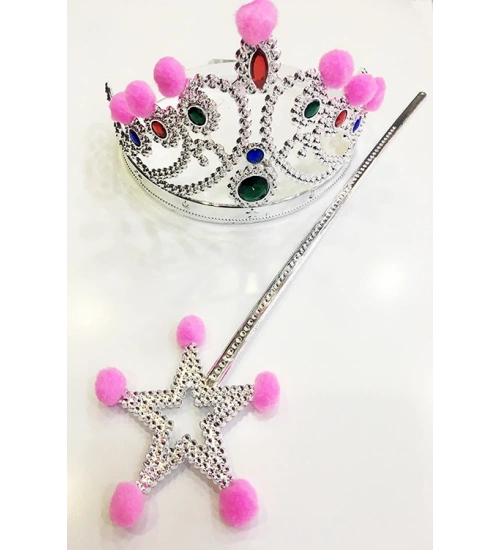 Pembe Ponponlu Gümüş Renk Prenses Tacı ve Gümüş Renk Prenses Asası