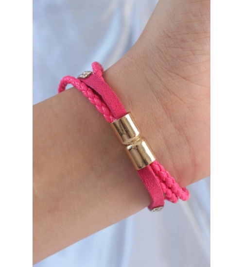 Pembe Renk Zirkon Taşlı Deri Çoklu Bileklik