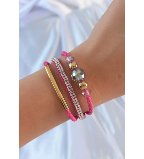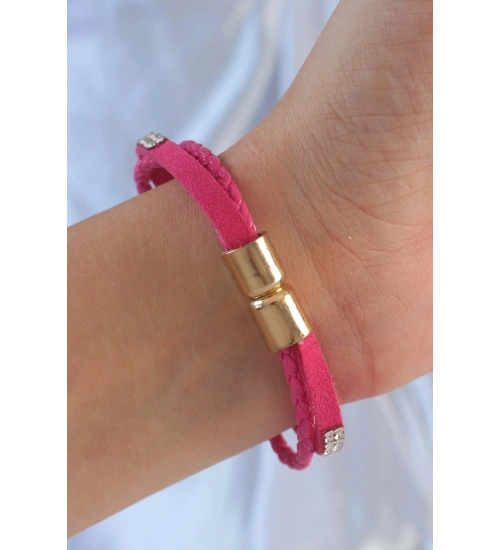 Pembe Renk Zirkon Taşlı Deri Çoklu Bileklik