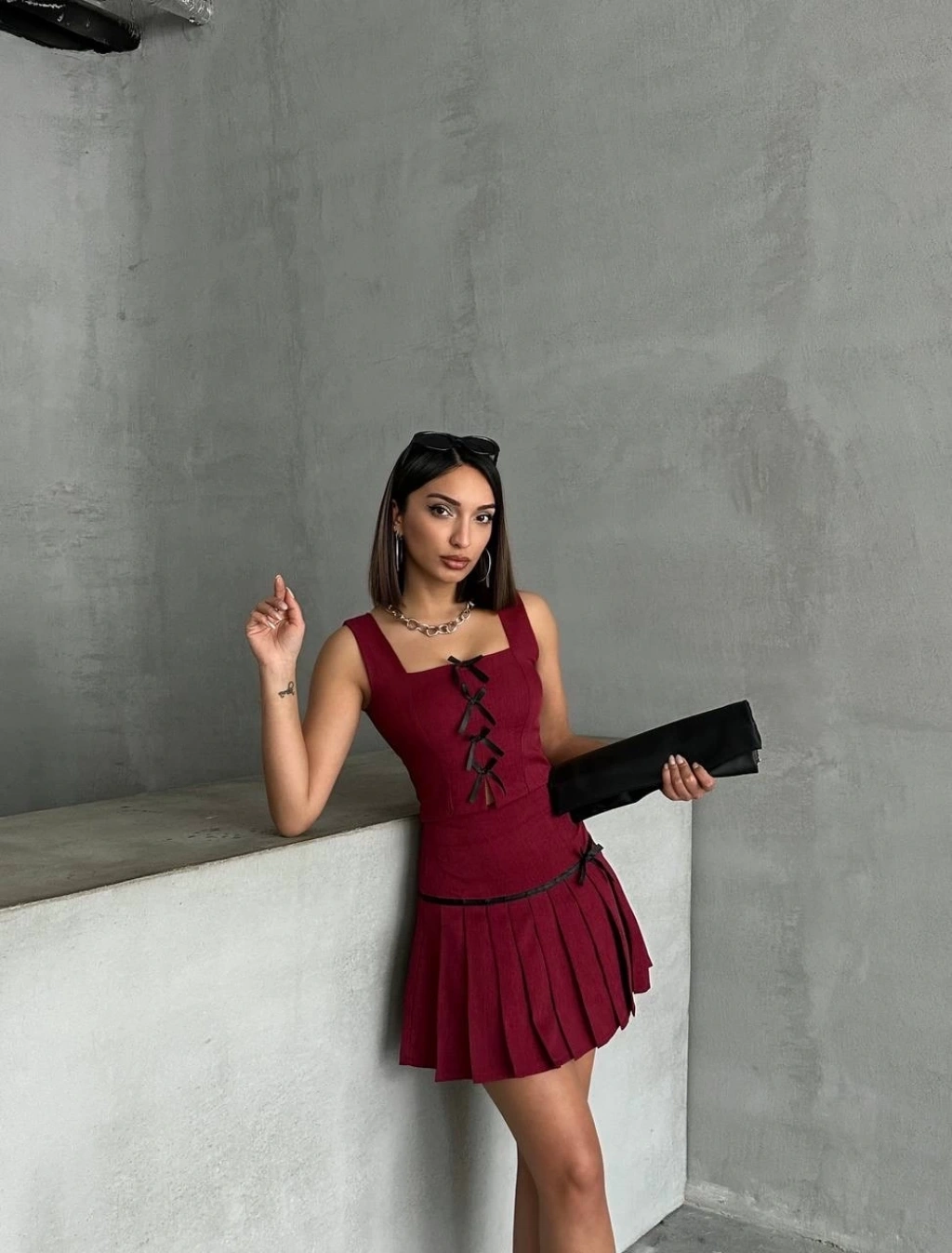 Pileli etek yelek takım bordo S255015, gardırobunuzun vazgeçilmezi olmaya aday!