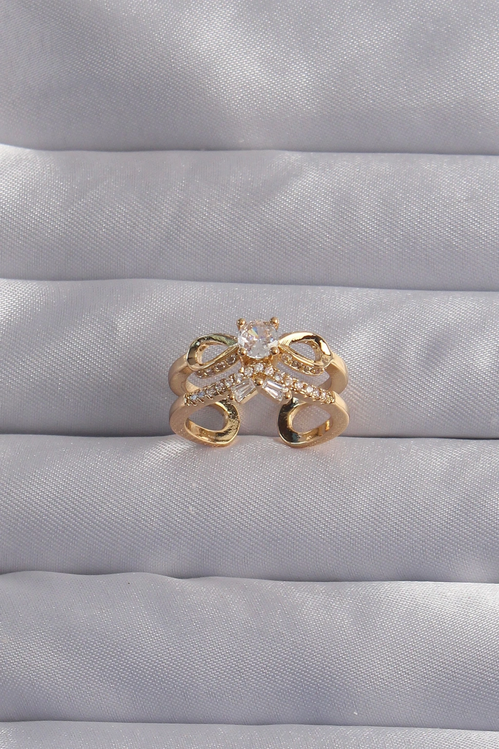 Pirinç Ayarlamalı Gold Renk Zirkon Taşlı 2li Görünüm Fiyonk Yüzük