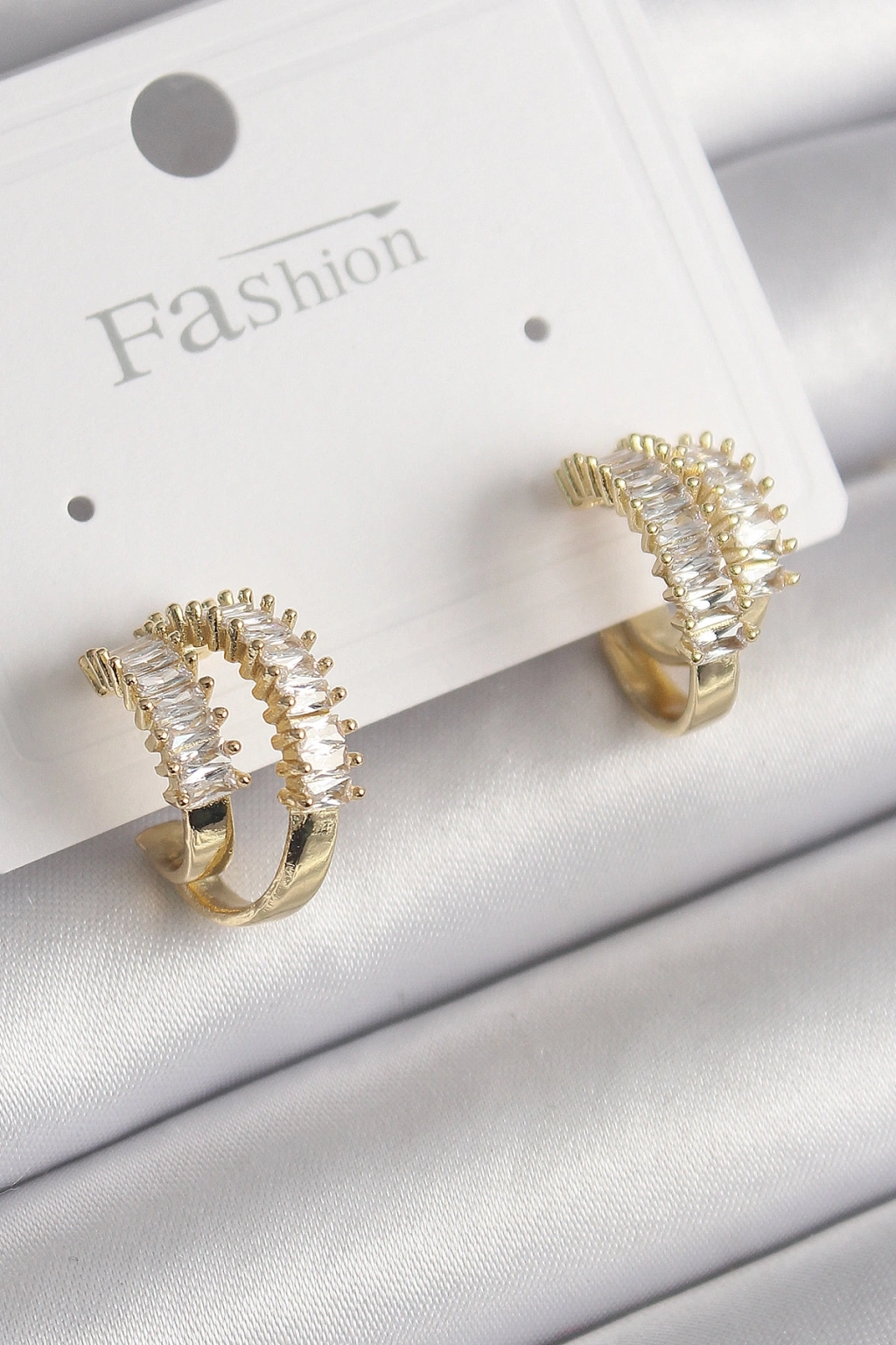 Pirinç Gold Renk 2'Li Zirkon Taşlı Halka Model Kadın Küpe