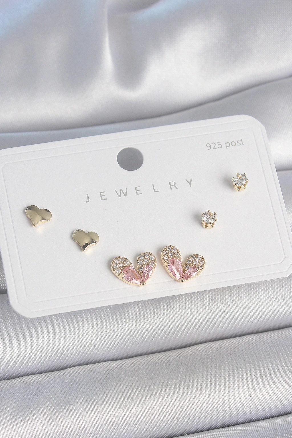 Pirinç Gold Renk Pembe Zirkon Taşlı Kalp Model 925 Ayar Gümüş Çivi Kadın Küpe Seti