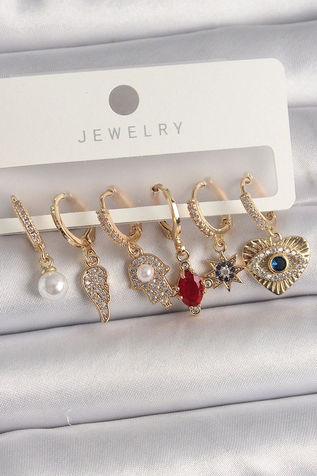 Pirinç Gold Renk Sallantı Zirkon Taşlı Fatma Ana El Figür Kadın Küpe Seti