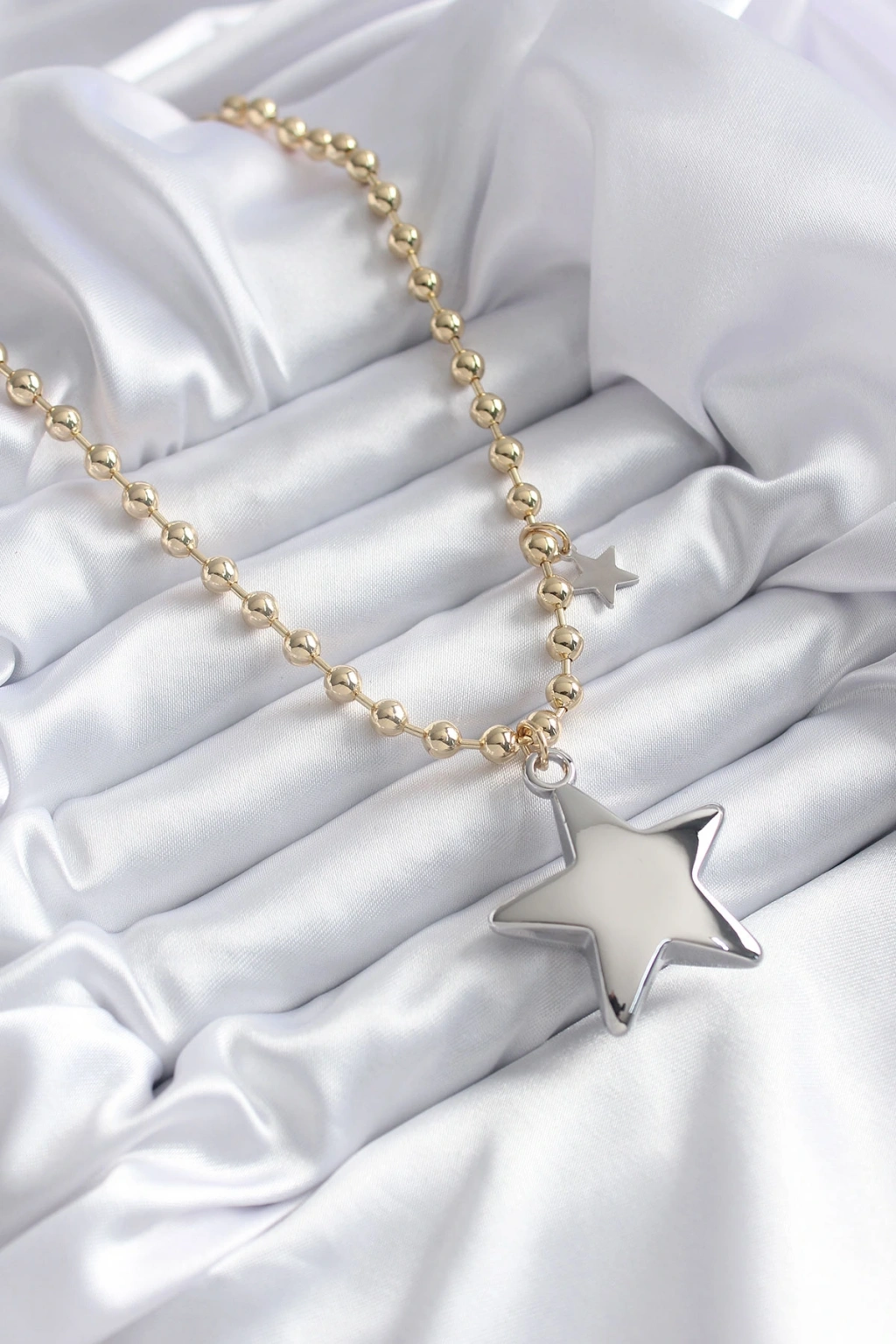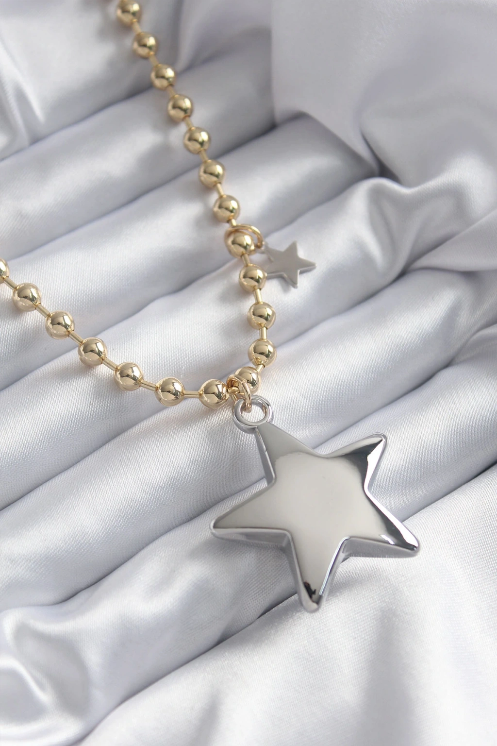 Pirinç Gold Renk Topçuk Zincir Gümüş 3d Yıldız Model Yıldız Detay Vip Kadın Kolye