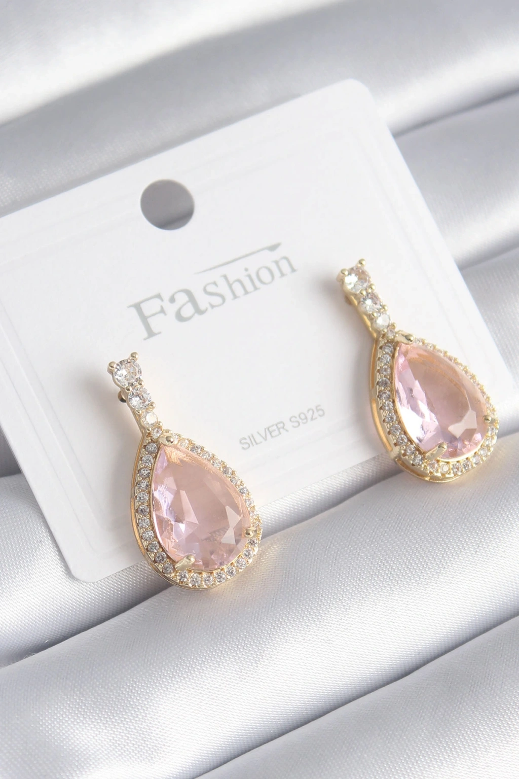 Pirinç Gold Renk Zirkon Taş Detay Damla Pembe Zirkon Taş Model Kadın Küpe