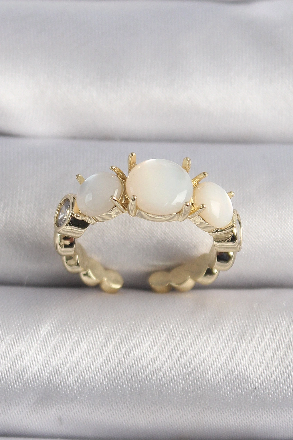 Pirinç Gold Renk Zirkon Taş Detaylı Beyaz Sedefli Vıp Seri Kadın Yüzük