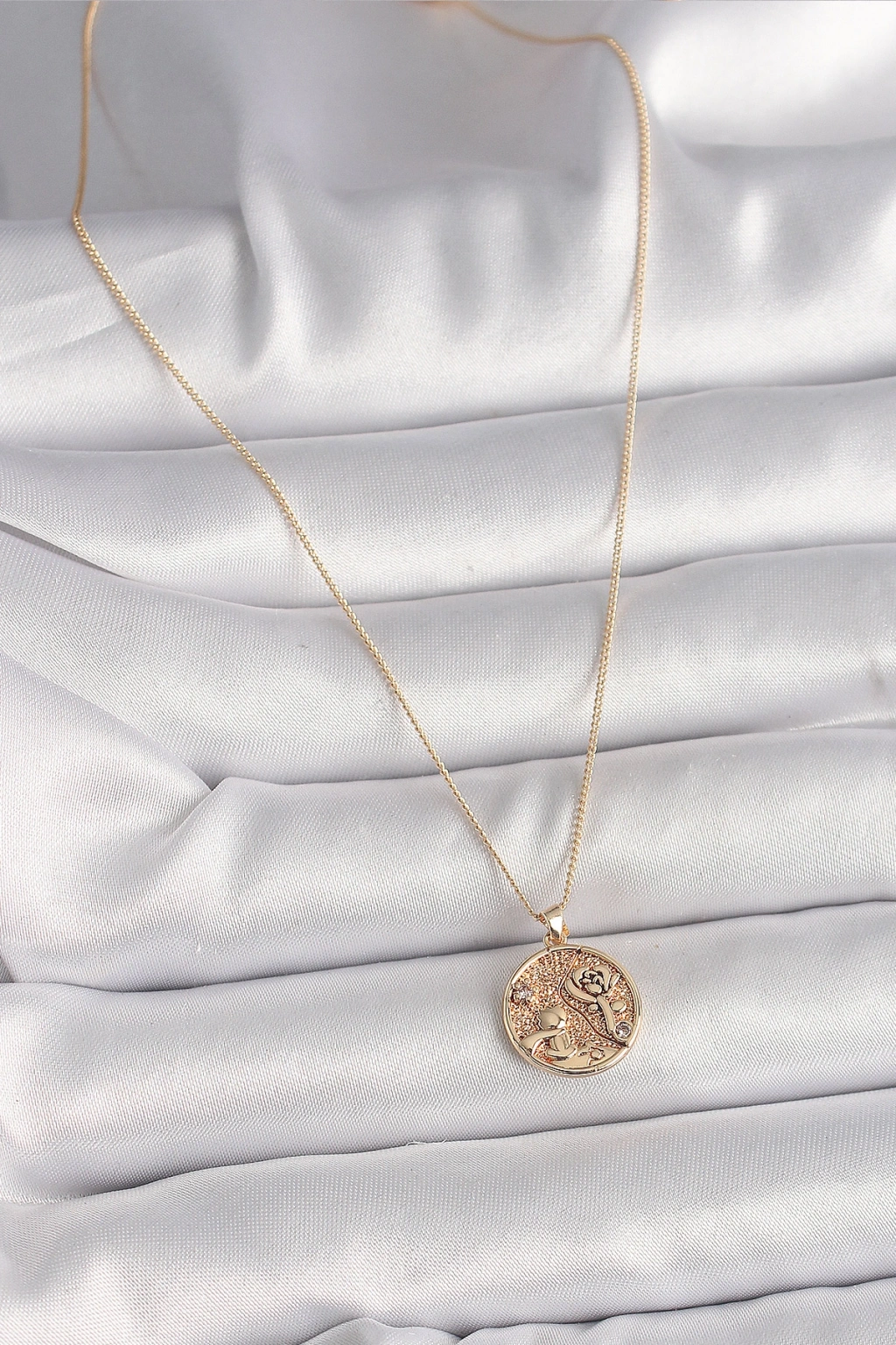 Pirinç Gold Renk Zirkon Taş Detaylı Gül İşleme Madalyon Model Kadın Kolye
