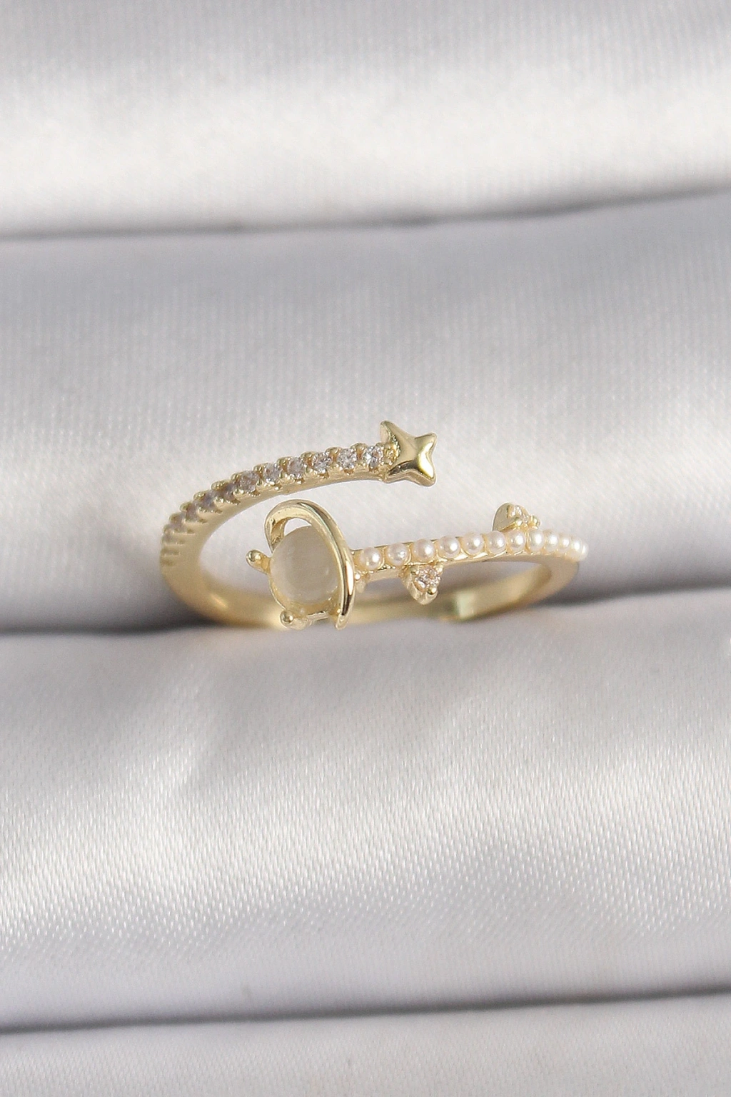 Pirinç Gold Renk Zirkon Taşlı Beyaz Mineli Yıldız Detaylı Ayarlanabilir Kadın Yüzük