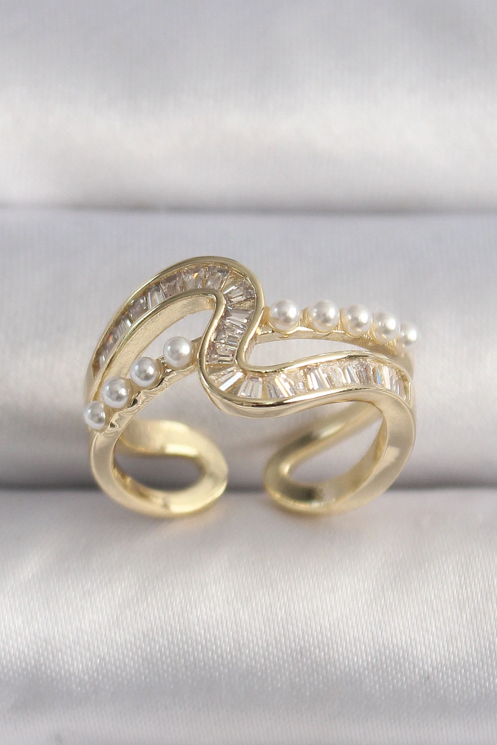 Pirinç Gold Renk Zirkon Taşlı İnci Detay Vıp Seri Kadın Yüzük
