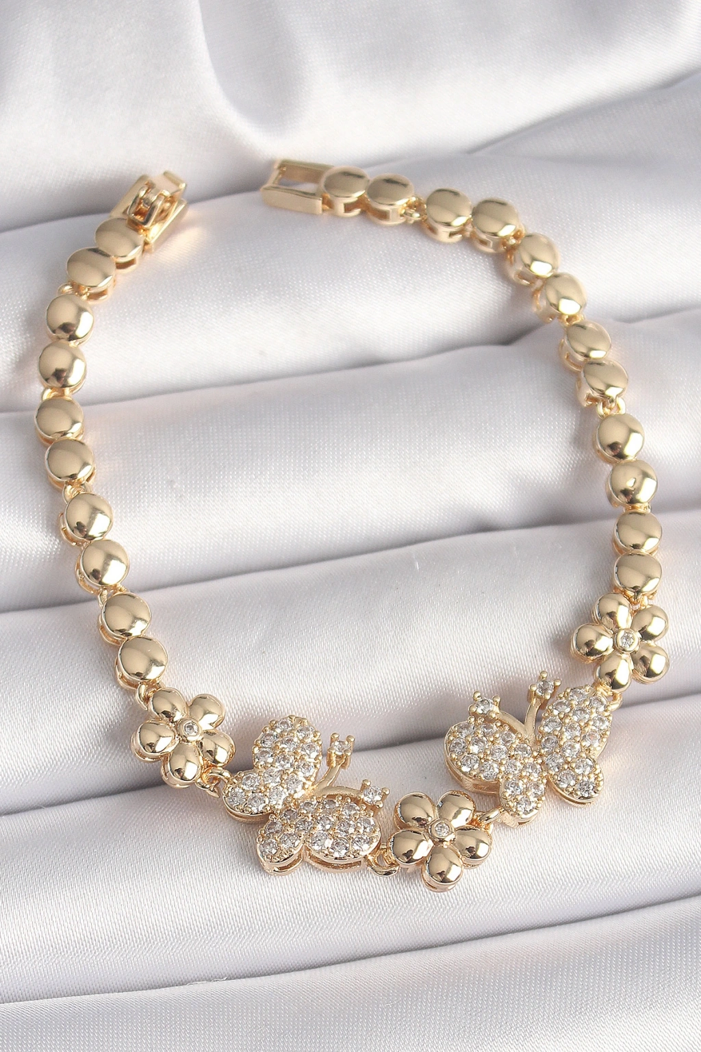 Pirinç Gold Renk Zirkon Taşlı Kelebek Figür Çiçek Zincir Model Kadın Bileklik