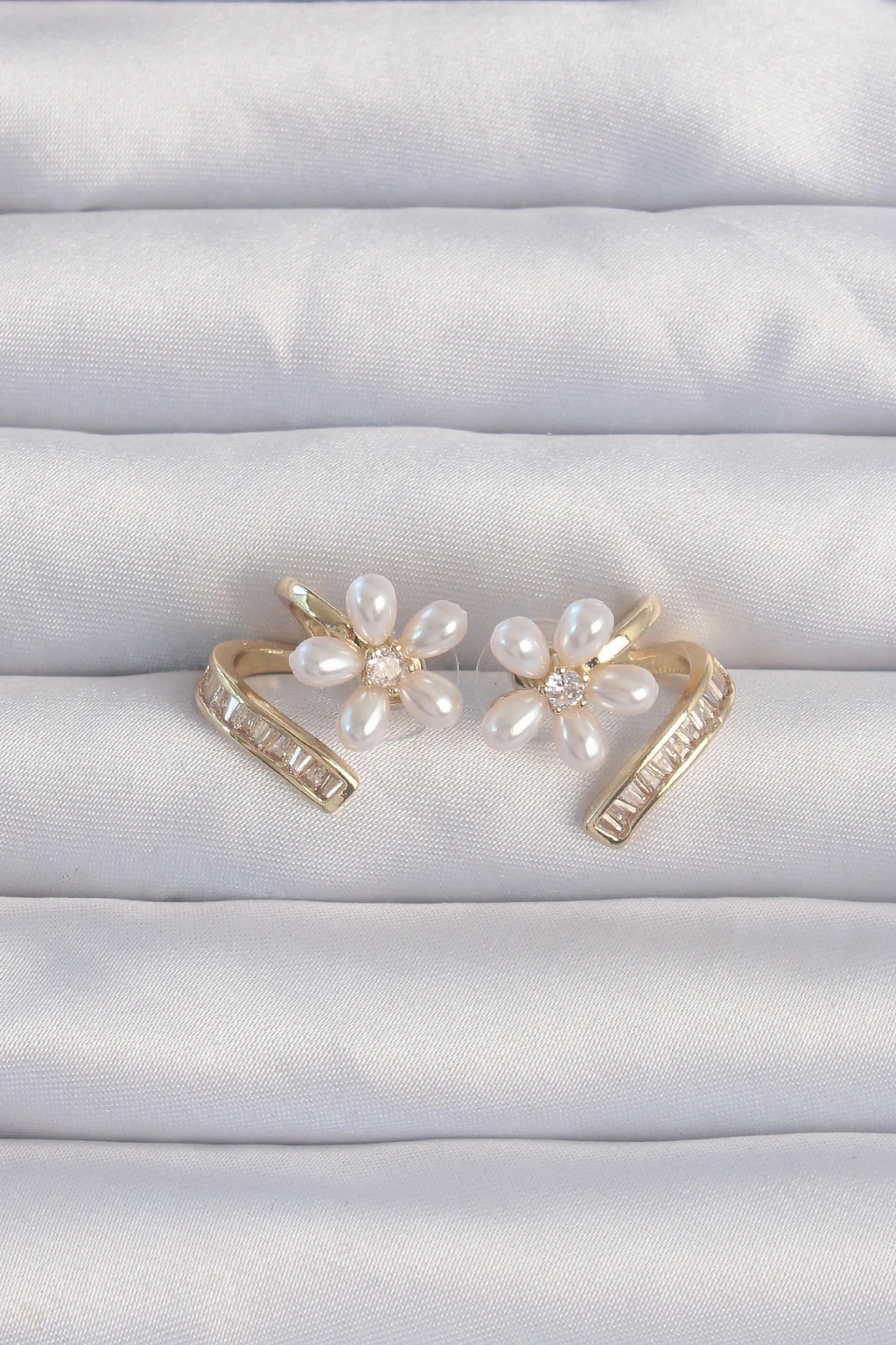 Pirinç Gold Renk Zirkon Taşlı Kıvrımlı İnci Çiçek Küpe