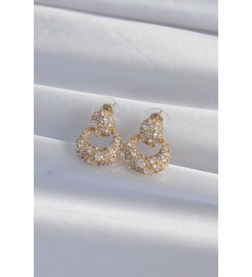 Pirinç Gold Renk Zirkon Taşlı Oval Form Küpe