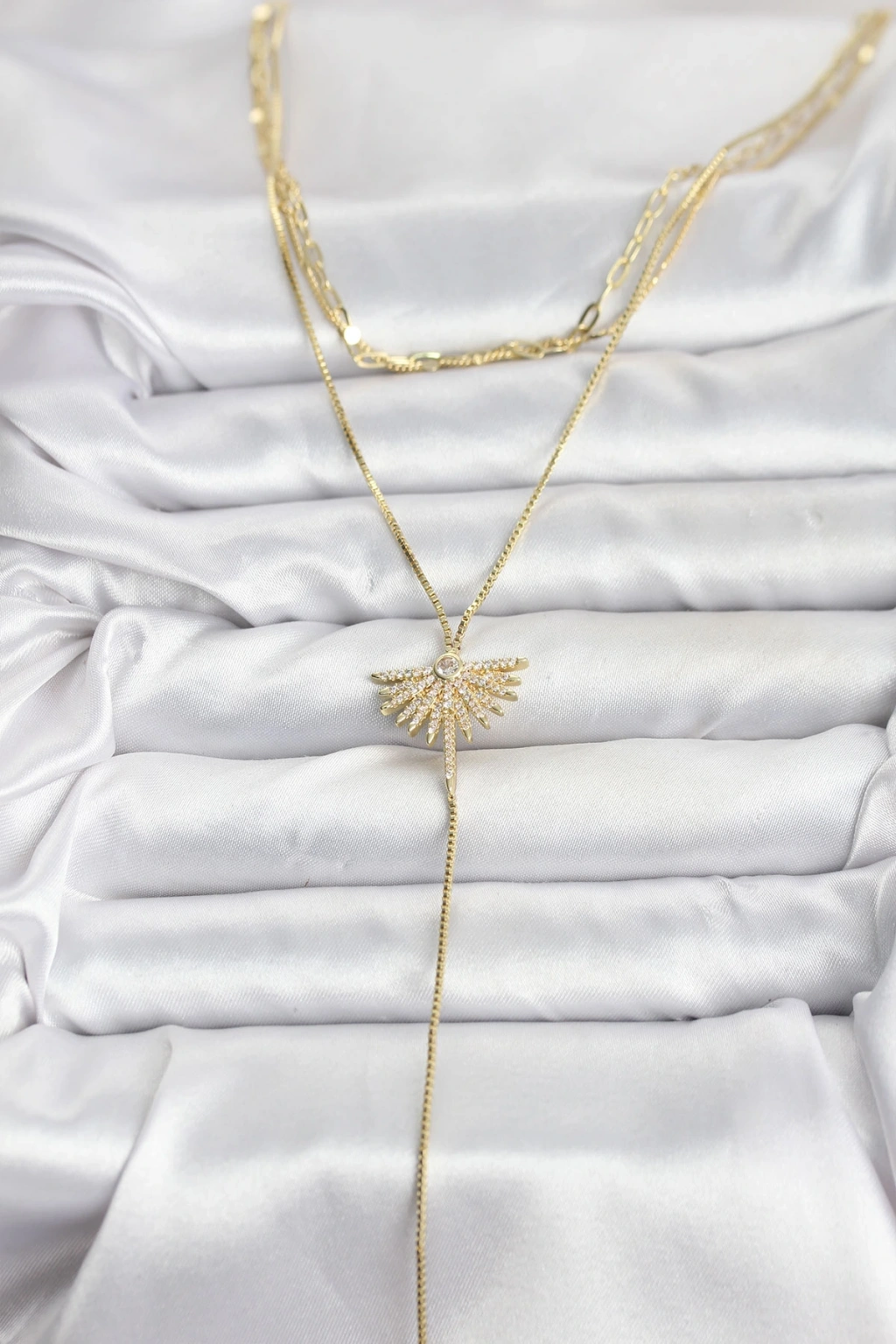 Pirinç Gold Renk Zirkon Taşlı Yelpaze Model Detaylı 3'lü Kombin Y Kadın Kolye