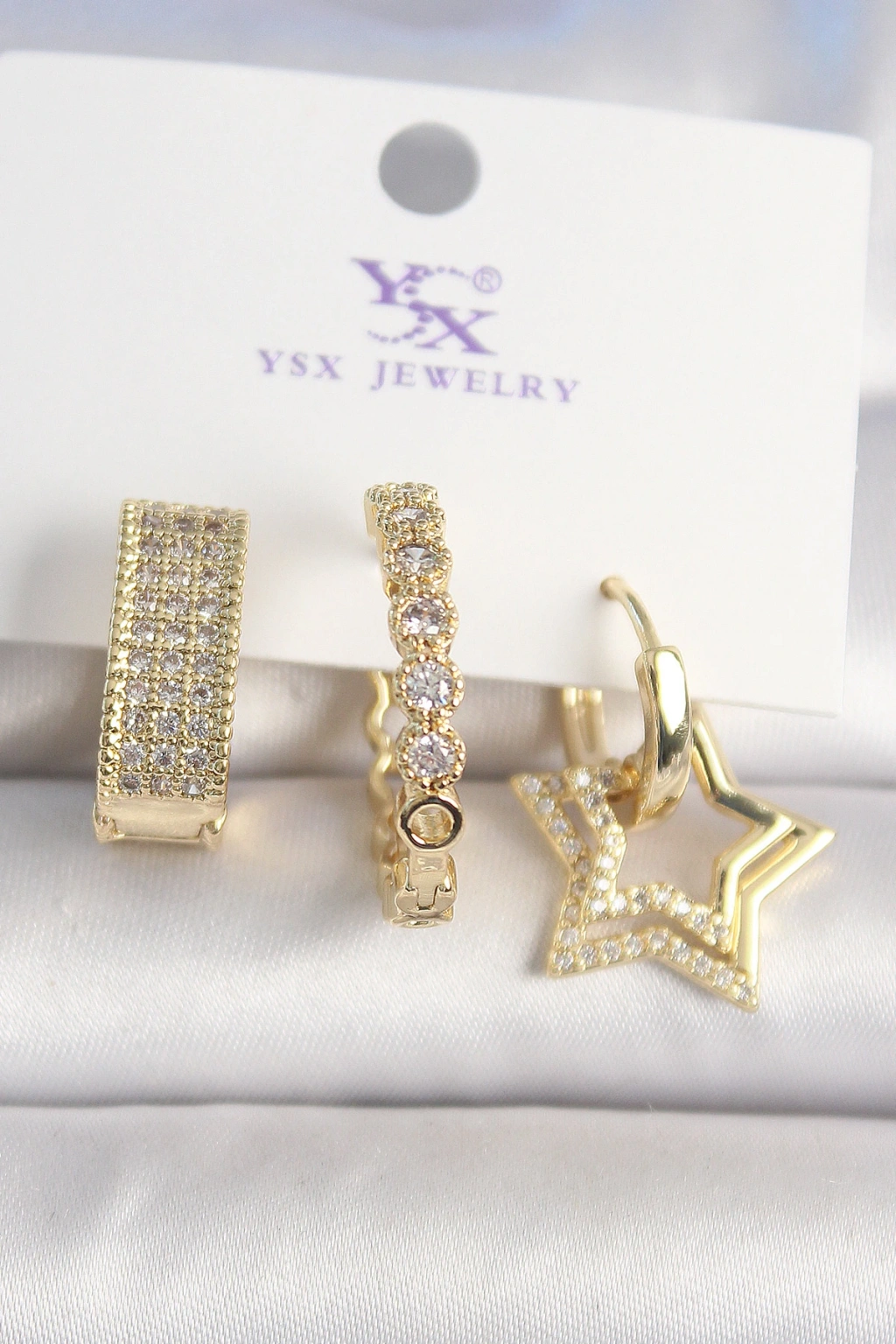 Pirinç Gold Renk Zirkon Taşlı Yıldız Figür Halka Model 3'lü Kadın Kombin Küpe