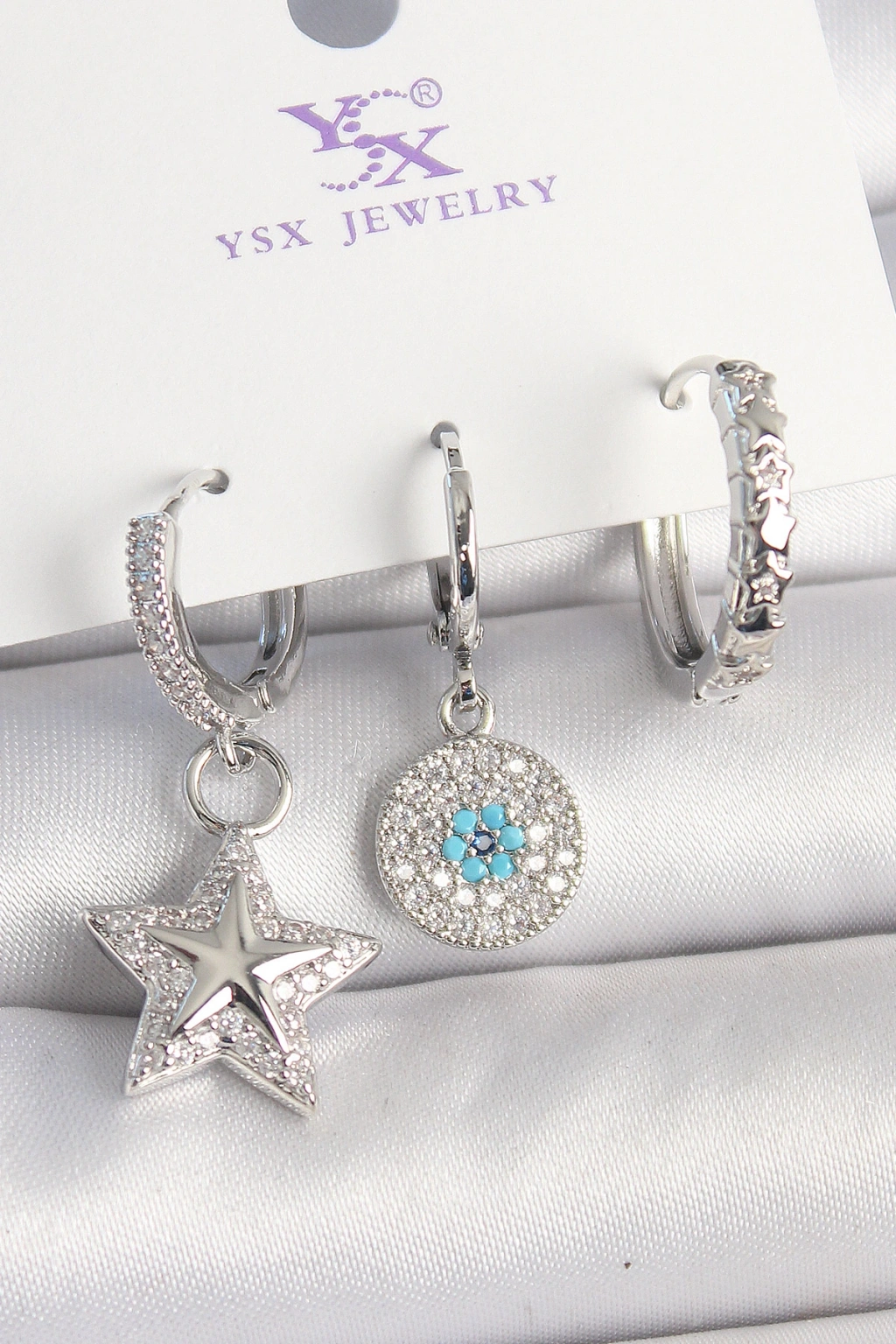 Pirinç Gold Renk Zirkon Taşlı Yıldız Model Nazar Boncuk Detay 3'lü Kadın Kombin Küpe