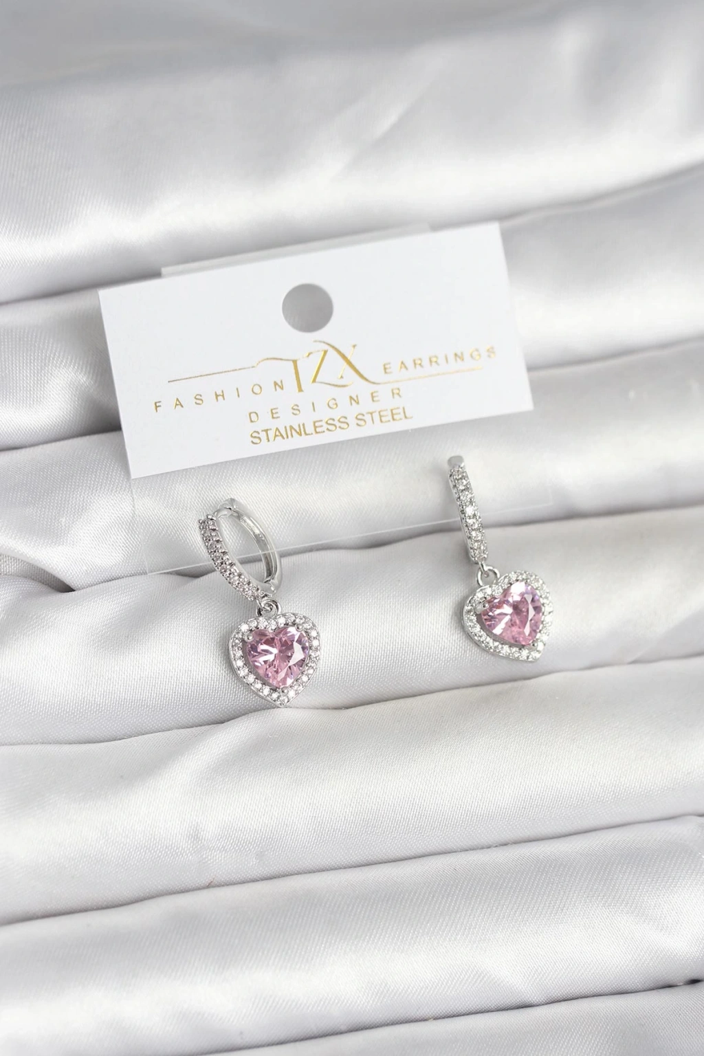 Pirinç Gümüş Pembe Renk Zirkon Taşlı Kalp Model Kadın Küpe