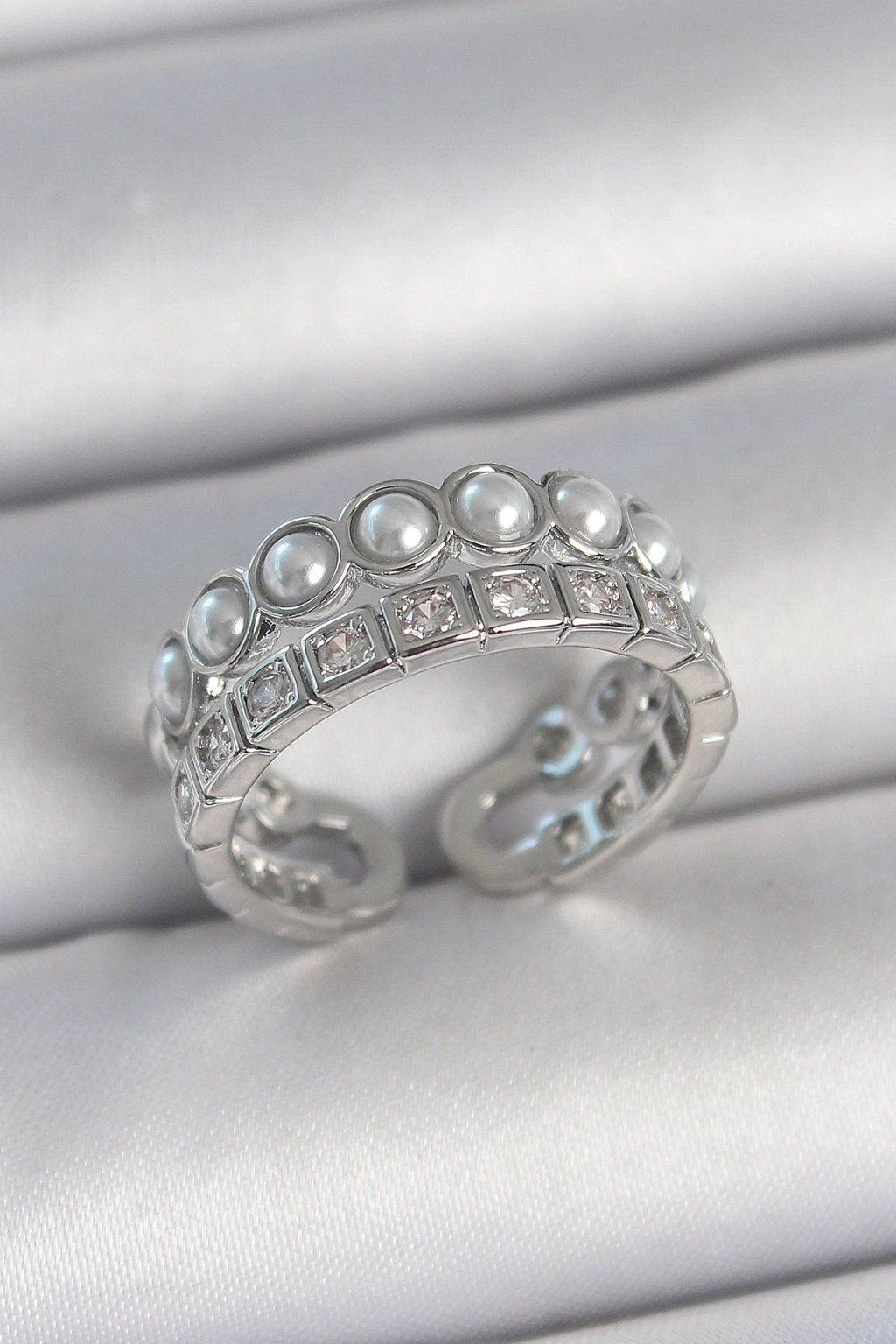 Pirinç Gümüş Renk 2'li Sıra Zirkon Taşlı Ve İncili Ayarlanabilir Kadın Yüzük